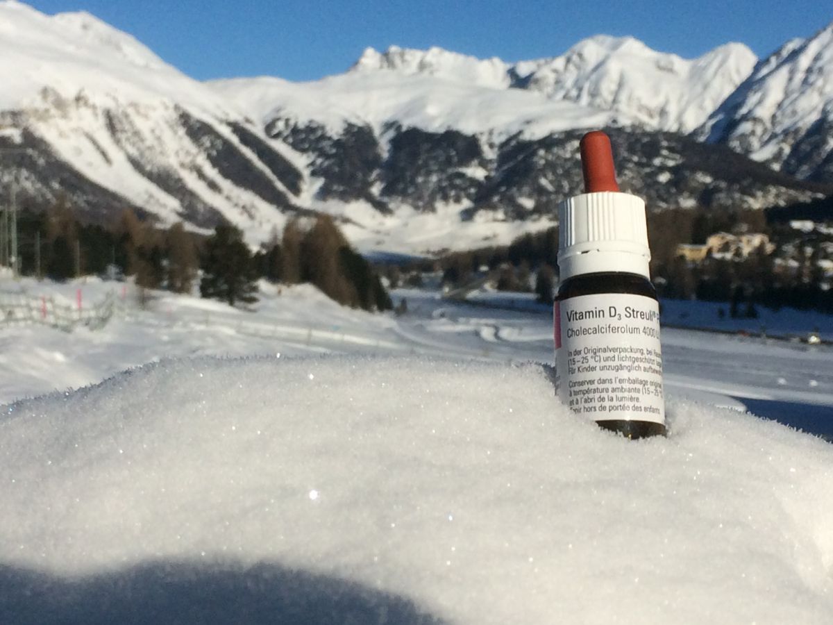 Dafür erfahre ich, dass man Vitamin D nur zu einem kleinen Teil mit Nahrung aufnehmen kann, etwa mit fettreichen Fischen; der grösste Teil produziert der Körper selbst, darum ist es eigentlich kein Vitamin, sondern mehr ein Hormon. Für die körpereigene Produktion braucht es allerdings Sonne, UVB-Strahlung, die in die Haut dringt, um genau zu sein. Sonne?! Davon haben wir im Engadin doch mehr als genug; manche Touristiker behaupten sogar, in St. Moritz scheint die Sonne an 400 Tagen im Jahr. Und ich bin ja oft draussen am Sport treiben. Weshalb also der Mangel? Schuld ist zum Teil mein pflichtbewusstes Auftragen von Sonnenschutzmitteln, wie ich es von der hypochondrischen Gesellschaft brav gelernt habe. Was ich nicht gewusst habe: Gute Sonnencremes behindern die Vitamin-D-Produktion. Auch sollte die Sonne auf möglichst viel Hautfläche treffen. Plötzlich fällt mir eine spektakuläre Therapieform ein, um die wenig attraktive Mangelerscheinung zu beheben: Ich könnte jeden Tag in Badehosen Snowboarden gehen, in der Mittagssonne und ohne Sonnenschutzmittel. Doch auch dies würde wenig nützen; denn im Winter ist der Sonnenstand in unseren Breitengraden zu niedrig, sodass kaum UVB-Strahlung durch die Atmosphäre dringt, selbst auf der sonnenverwöhnten Corviglia während der Mittagszeit nicht.