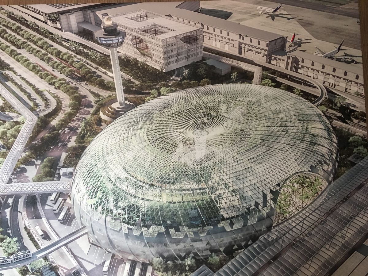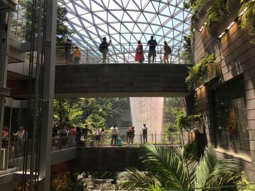 Wer nicht weiss, was los ist, glaubt sich auf einem Filmset. Unter einer gigantischen Plastikhaube, einer Raumstation eines Science Fiction Streifens nicht unähnlich, stürzt mitten auf dem Flughafengelände eine 43 Meter lange Wassersäule nieder. Rundherum ein dichter Wildwuchs aus Palmen, Gummibäumen und sonstigem Gesträuch. Die Shuttlezüge, die die Flughafen-Terminals miteinander verbinden, fahren mitten durch dieses Wunderland. Völlig unerwartet und verwundert staunte ich kürzlich – im Transit von Australien nach Indien - aus dem Zugsfenster und vergass in der Verwunderung, meinen Koffer festzuhalten. Doch: Was zunächst verwirrlich anmutete, entpuppt sich als perfekter PR-Trick. Natürlich will auch ich genauer sehen, was ich aus dem Shuttle nur erhaschen konnte: Den Welt höchsten Indoor-Wasserfall plus Dschungelpflanzen mit Lichtshow und – typisch Singapur - gigantischem Shopping Center. Die Singapuri nennen das alles «Jewel».