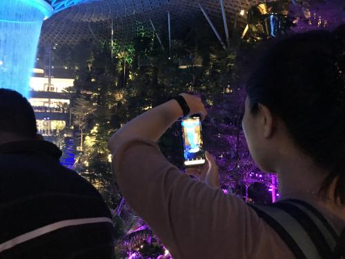 Der Ansturm auf das Juwel war noch Tage nach der offiziellen Eröffnung ungeheuerlich. Ordnungskräfte versuchten, den Besucherstrom zähmen. Touristen, die glaubten, ihre Transitzeit im Flughafen mit einem Besuch des Sturzbaches zu verkürzen, verpassten wegen den langen Warteschlangen und dem Chaos gar ihre Anschlussflüge. Das Juwel unter einer gigantischen Haube, in der im tropischen Inselstaat erfrischende 23 Grad herrscht während draussen innert Kürze das T-Shirt am Rücken klebt. Offenbar soll das Jewel dank neuster Technik zwar nicht gerade energieneutral sein, aber dennoch halbwegs vernünftig bezüglich Wasser- und Stromkonsum – sagen die Verantwortlichen. Ich sitze auf einer Bank und schaue dem Treiben fasziniert zu – den Leuten, die ihre Grosskoffer durch den Dschungel rollen, die Enkelinnen, die ihre Grossmütter im Rollstuhl möglichst nahe an den Wasserfall karren, all die Selfie-Stangen, die ausgefahren werden, um Orchideen in Makro und Grossfamilien im Gegenlicht zu knipsen. So richtig bunt wird es nachts, wenn die Kunstwelt mit violett, blau und rot bestrahlt wird. Alle paar Stunden gibt es eine Lichtshow mit Musik. Pinke Palme. Blutroter Wasserfall. Hellblaue Gummibäume. Wir Menschen sind schon eigenartige Wesen. Bauen uns romantische Natur, nachdem wir die ursprüngliche verschmutzt und kaputt gemacht haben, bestrahlen die Kunstwelt mit rot und blau, statt uns am natürlichen Grün satt zusehen. Und zum guten Schluss beschallen wir das ganze mit Beats vom Synthesizern und reduzieren das Rauschen des Wasserfalles auf WHO-normiertes, medizinisch unbedenkliches Niveau. Da wirkt der ohrenbetäubender Lärm von den Flugzeuge auf dem nahen Flugfeld fast natürlicher.