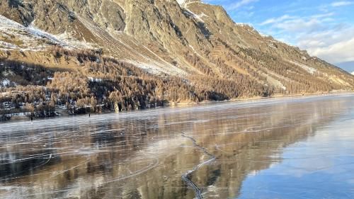 Über den Silsersee gleiten Ende Jahr? Er war gefroren und schneefrei. Gleitend streckte ich die Arme aus. So fühlt sich fliegen an, dachte ich. Und ich fühlte es. Es war wie in einem Flug- und Schwebetraum: echt. Reales Abheben. Ein Wesen der Luft und des Luftigen werden. Leicht wie ein Spatz. Zwischen Himmel und Erde. Ohne Bekenntnisse. Ohne Rechtfertigung. In der flirrenden Musik des Sees, der sich zum Ufer streckt und an sich selbst zieht, rundum und quer hindurch. Er lebt. Nicht nur den Rissen entlang, die wie Seufzer sind. Er lebt in den hingestreuten und gestaffelten Eisblumen und in den schwarzen Aderungen, die sich abwechseln mit den zuckrigen Spuren der Kufen. Ab und zu eine Spitzendecke, ausgebreitet wie ein kleines Gedeck auf dem riesigen Spiegel aus Obsidian: Vulkanglas, das aus der Tiefe aufgestiegen ist, über Nacht. Erdgeschichte statt Geschichte, die sich auflöste in meinem Flug. Er endete, als ich einem Schlittschuhläufer ausweichen musste.