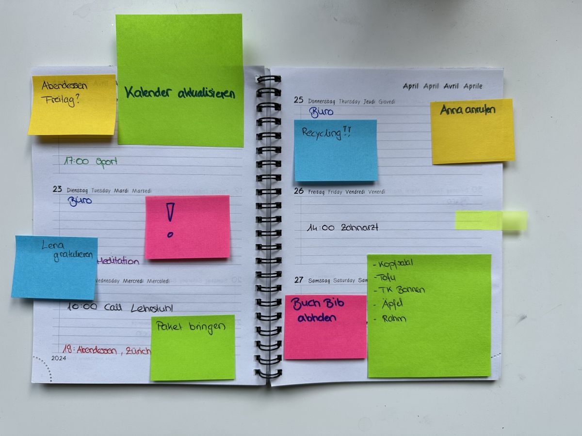Es ist ein später Nachmittag in der Universitätsbibliothek. Ich sitze an einem Gruppentisch und lerne für die nächste Prüfung, schreibe gleichzeitig noch ein bisschen an einem Aufsatz und recherchiere nebenbei noch für eine Präsentation, die ich nächste Woche halten muss. Der Kopf ist nicht mehr ganz klar, die Augen sind müde und mein Blick schweift über die anderen Mitstudierenden, die mein Schicksal an diesem Donnerstagabend teilen und noch vor ihren Laptops sitzen. Und da sticht mir etwas ins Auge. Vor einer Kommilitonin liegt ein Buch mit dutzenden farbigen Post-its auf den Seiten verteilt. Die blauen, pinken, gelben, orangen und grünen Zettelchen leuchten in den grauen Lernräumen wie ein Regenbogen auf und ziehen mein Blick auf sich. Es ist ein kleines Kunstwerk. Als mein Blick ein paar Tische weiter schwebt, sehe ich die gleichen Farben wieder in Form von Klebezettel in einer Agenda, versehen mit kleinen Notizen, die wohl an verschiedene To-Dos erinnern sollen. Und so schweifen meine Gedanken weg vom Lernen hin zu den kleinen farbigen Notizblättern.