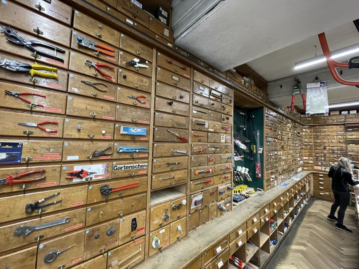 Eigentlich wollte ich dort nur einen Dichtungsgummi für den Dampfkochtopf kaufen. Doch dann wurde ich in meine Kindheit zurückkatapultiert. Verändert hat sich in all den Jahrzehnten kaum etwas. Breite Theken, dahinter Wände mit insgesamt 838 Schubladen, in denen sich von der Beisszange über Nägel jeglicher Grösse bis zu Türscharnieren alles findet. Wenn ein Kunde fünf Schrauben mit einem Senkfräskopf verlangt, steigt die Mitarbeiterin die Bockleiter hoch, öffnet die Schublade in der achten Reihe hinge rächts, nimmt die fünf Schrauben einzeln raus und verpackt sie. «Darfs süsch no öppis sii? Nid. De miechs de vierifüfenünzg. Danke und uf wiederluege.»