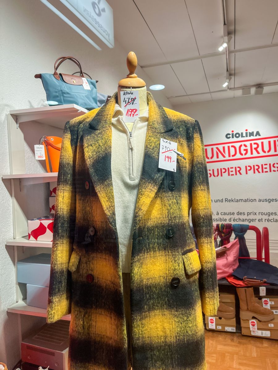 Gesagt, getan. Der Mantel ist tatsächlich ein schon fast unanständiges Schnäppchen, von satten 790 auf noch schlappe 199 Franken heruntergeschrieben. Differenz: 591 Franken. Ob ihr der Mantel trotzdem gefallen würde? Sie kommt hinzu, schaut und winkt ab. Na ja, ein Versuch war’s wert.