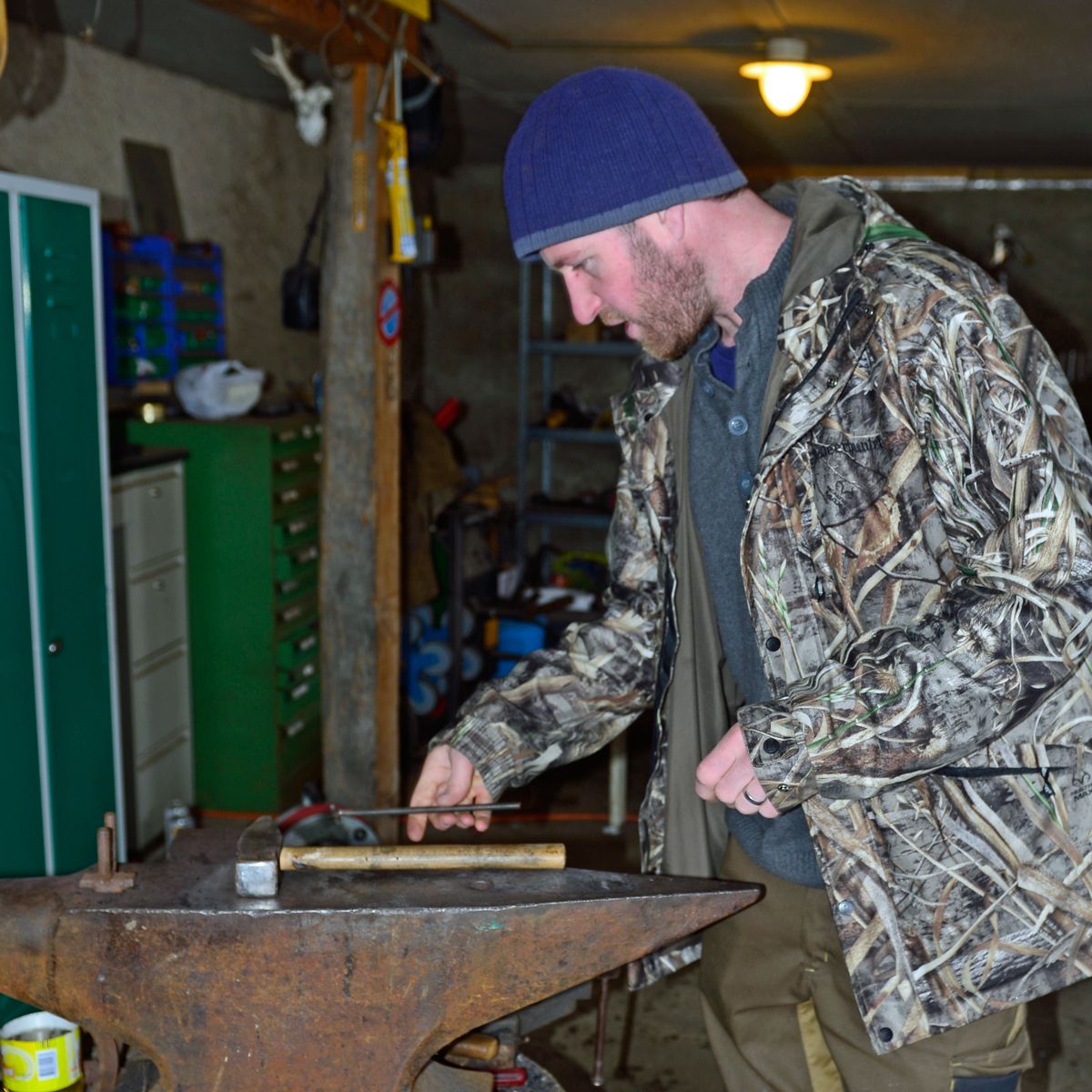 Roger Rominger in seinem Reich, der «Fuschina Schmiede». Hier hat er Raum, sich ganz seiner Leidenschaft, dem Messerschmieden zu widmen. Foto: Annina Notz