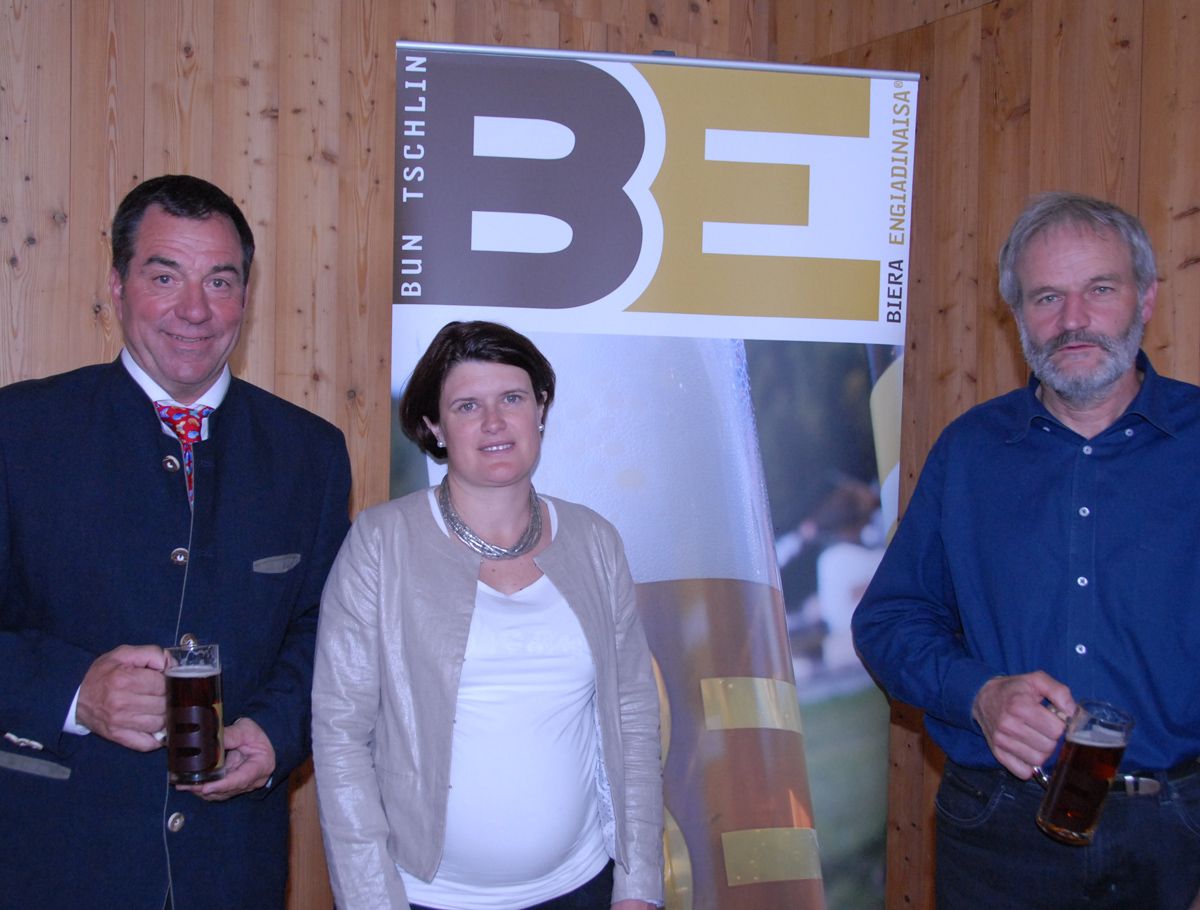Andrea Gilli (VR-Präsident), Manuela Ruinatscha-Michel und Cla Duri Janett anlässlich der Generalversammlung der Bieraria Tschlin SA (Foto: Nicolo Bass).