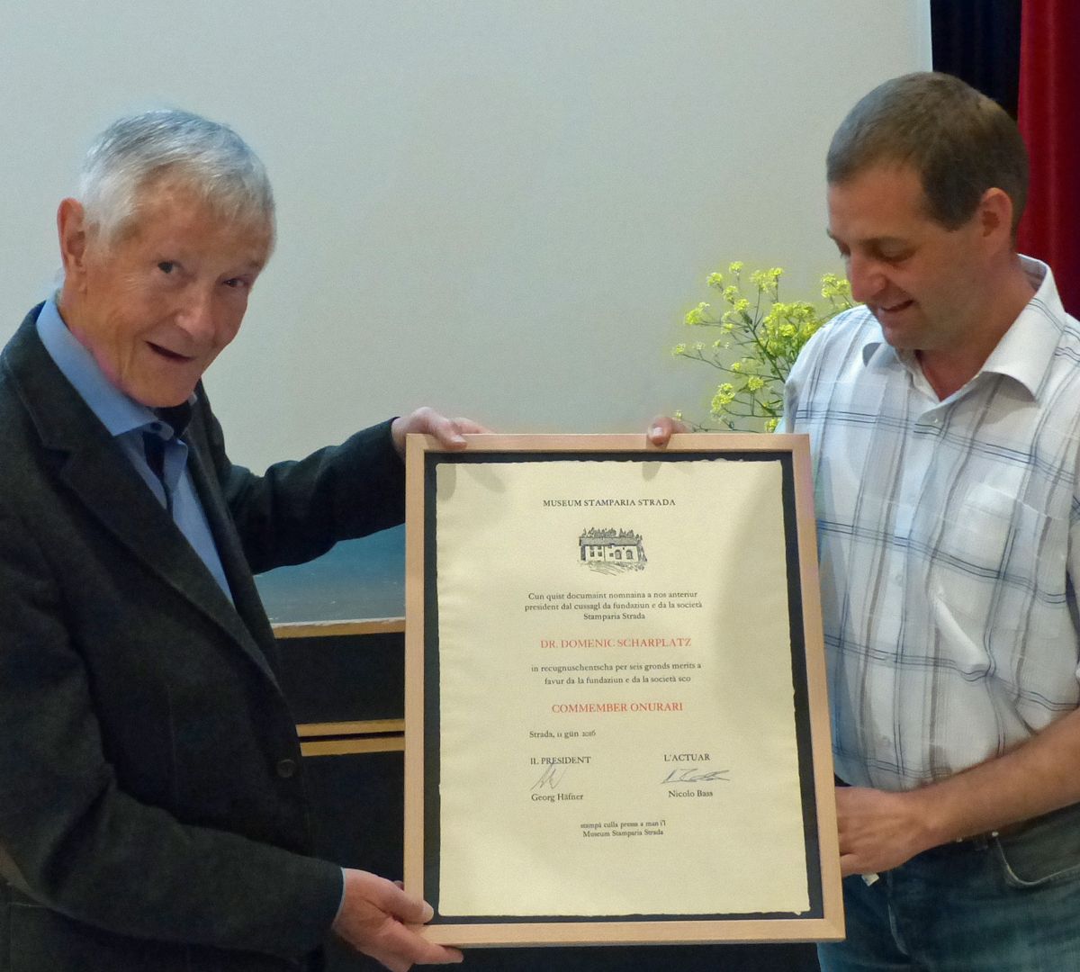In recugnuschentscha per seis merits survain Domenic Scharplatz (a schnestra) da Georg Häfner il documaint sco commember d’onur da la Stamparia Strada (fotografia: Flurin Andry).