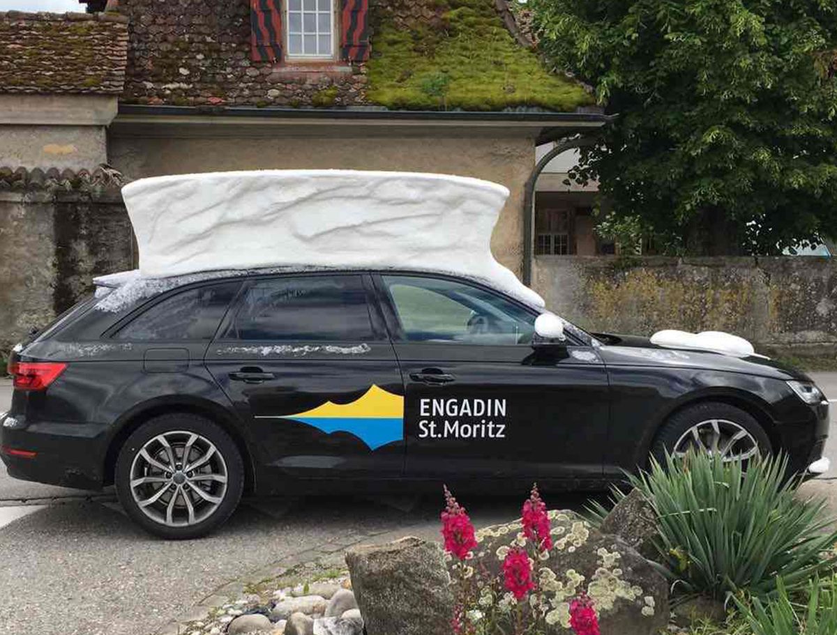 Engadin St. Moritz ist mit seinen Partnerdestinationen Davos-Klosters und Arosa an der zurzeit laufenden Tour de Suisse präsent. Unter anderem mit einem Auto mit «Schnee» auf dem Dach. Dieses soll auf den kommenden Winter aufmerksam machen.