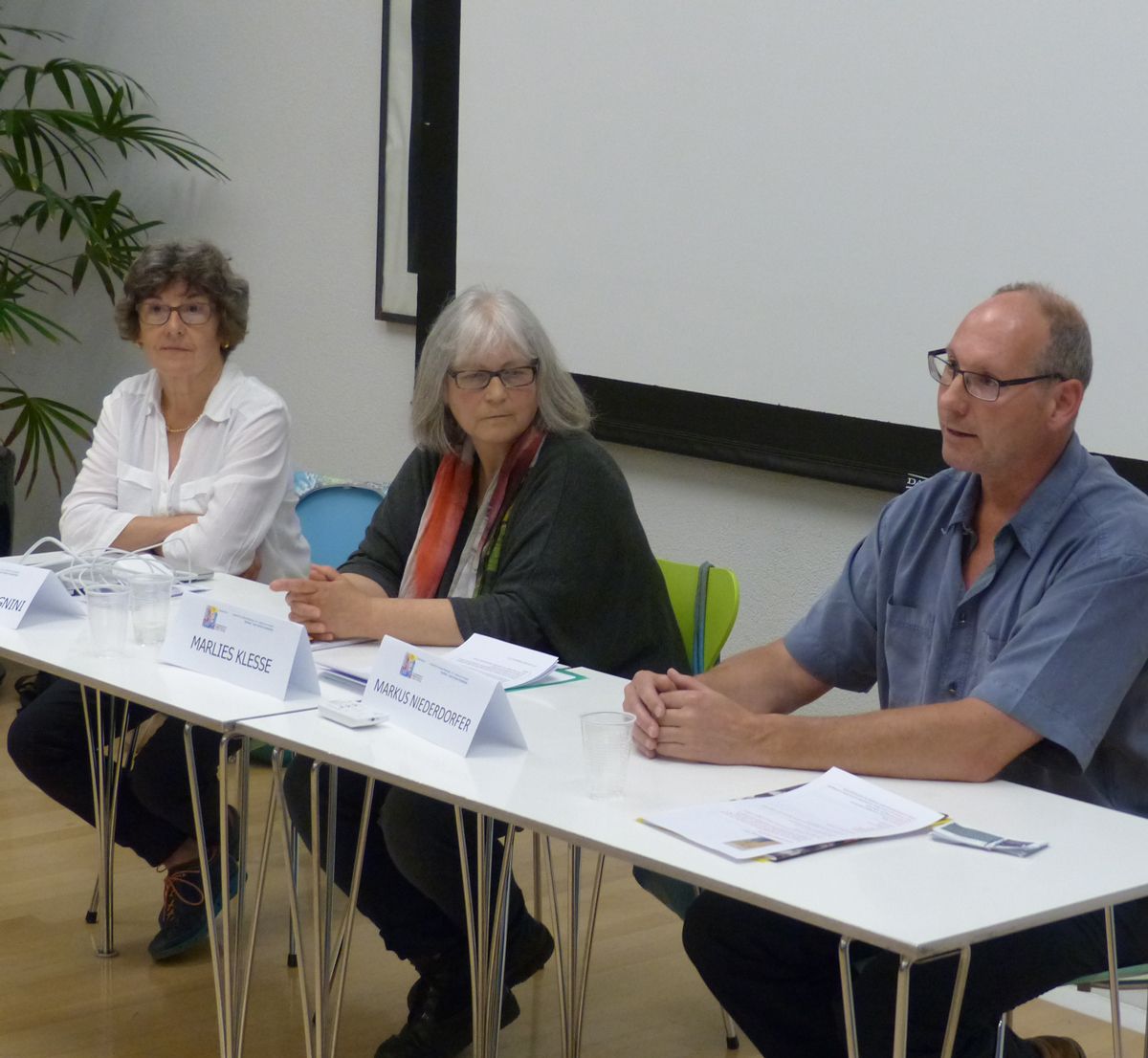 I’l local cultural dal Bogn Engiadina Scuol (BES) han preschantà Elisabeth Calcagnini, Marlies Klesse e Markus Niederdorfer lur argumaints cunter il Plan d’instrucziun 21 (fotografia: Flurin Andry).