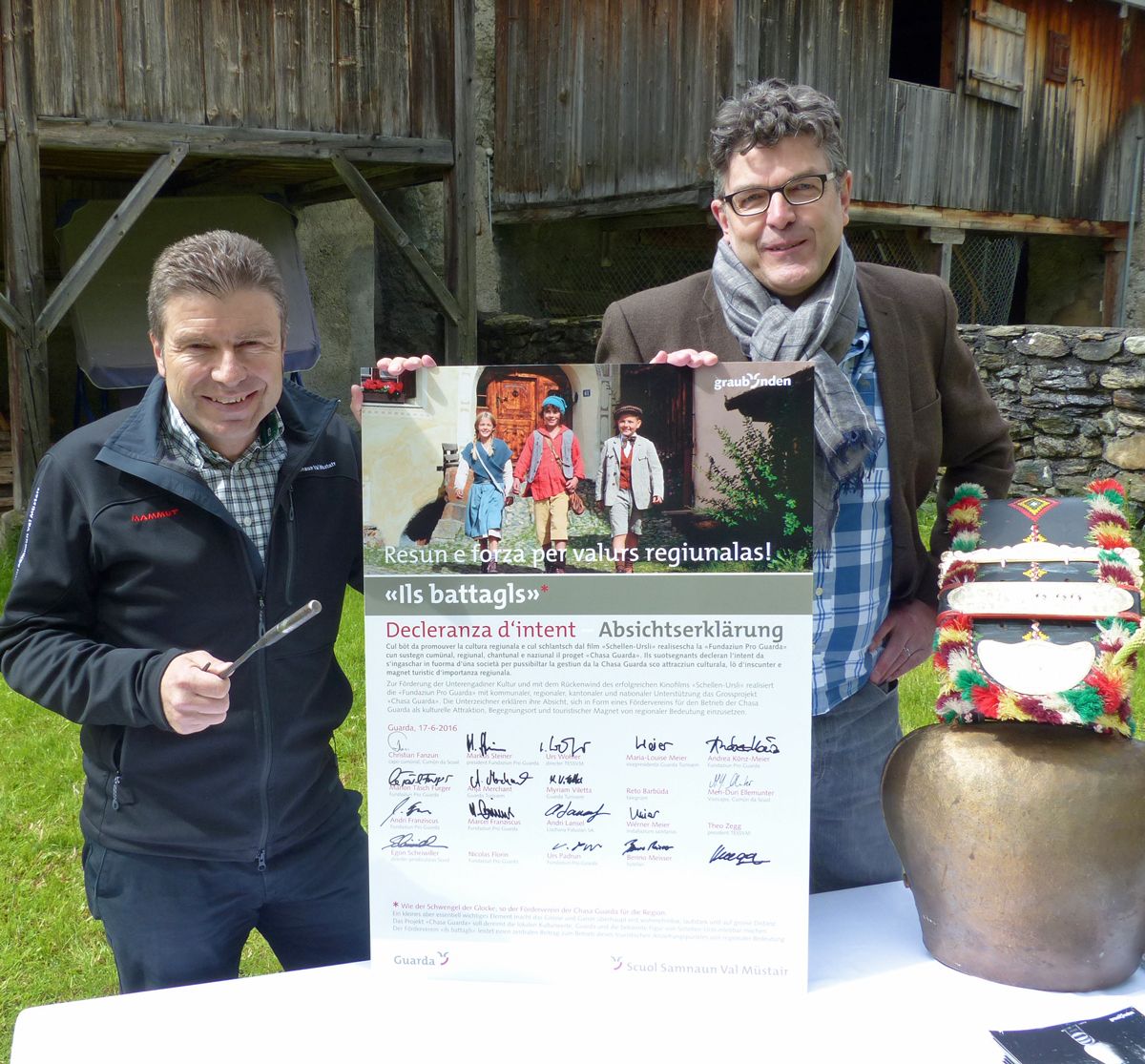 Urs Wohler (a schnestra), directer da la destinaziun turistica Engiadina Scuol Samignun Val Müstair e Markus Steiner, president da la fundaziun Pro Guarda, preschaintan la decleranza d’intent cullas prümas suottascripziuns (fotografia: Flurin Andry).