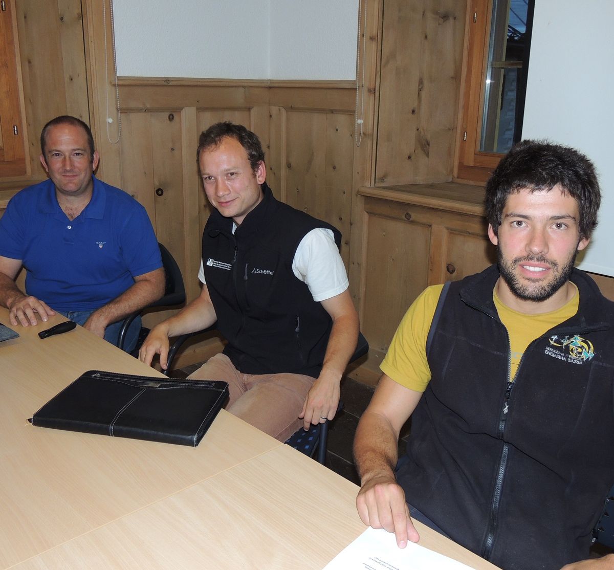 Arno Kirchen, Martin Kaiser ed Antonin Hugentobler (da schnestra) han infuormà davart ils resultats e las masüras da la crappa rodlada giò da la Foura da Glatscha ad Ardez (fotografia: Benedict Stecher).