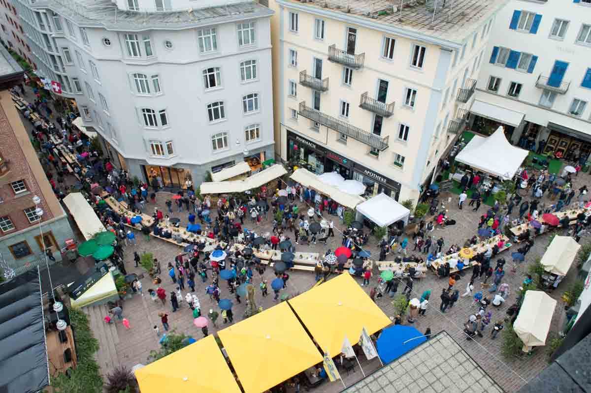 Bei sonnigem Wetter erfreuten sich schon am Samstag Touristen und Einheimische an der Tavolata mitten in der Fussgängerzone von St. Moritz. Die Anzahl der Tische wurde etwas verringert, so dass die Besucher etwas enger zusammenrücken mussten, aber dafür besseren Kontakt pflegen konnten. Am Sonntag setzte ein Regenschauer dem Fest ein nasses Ende.