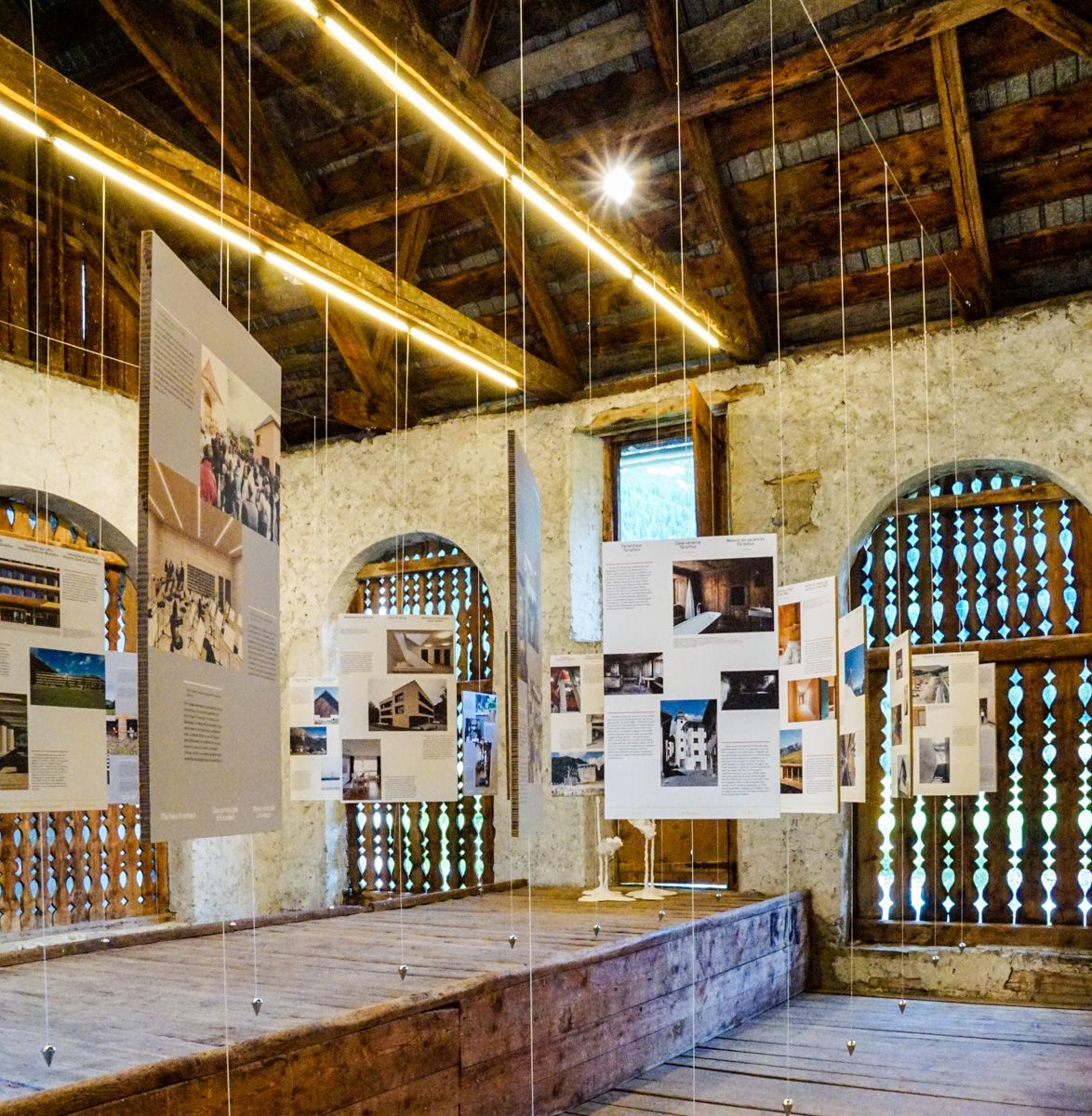 Einblick in die Ausstellung «Constructive Alps – Nachhaltiges Sanieren und Bauen in den Alpen» in der Stalla Madulain. Foto: Jon Duschletta