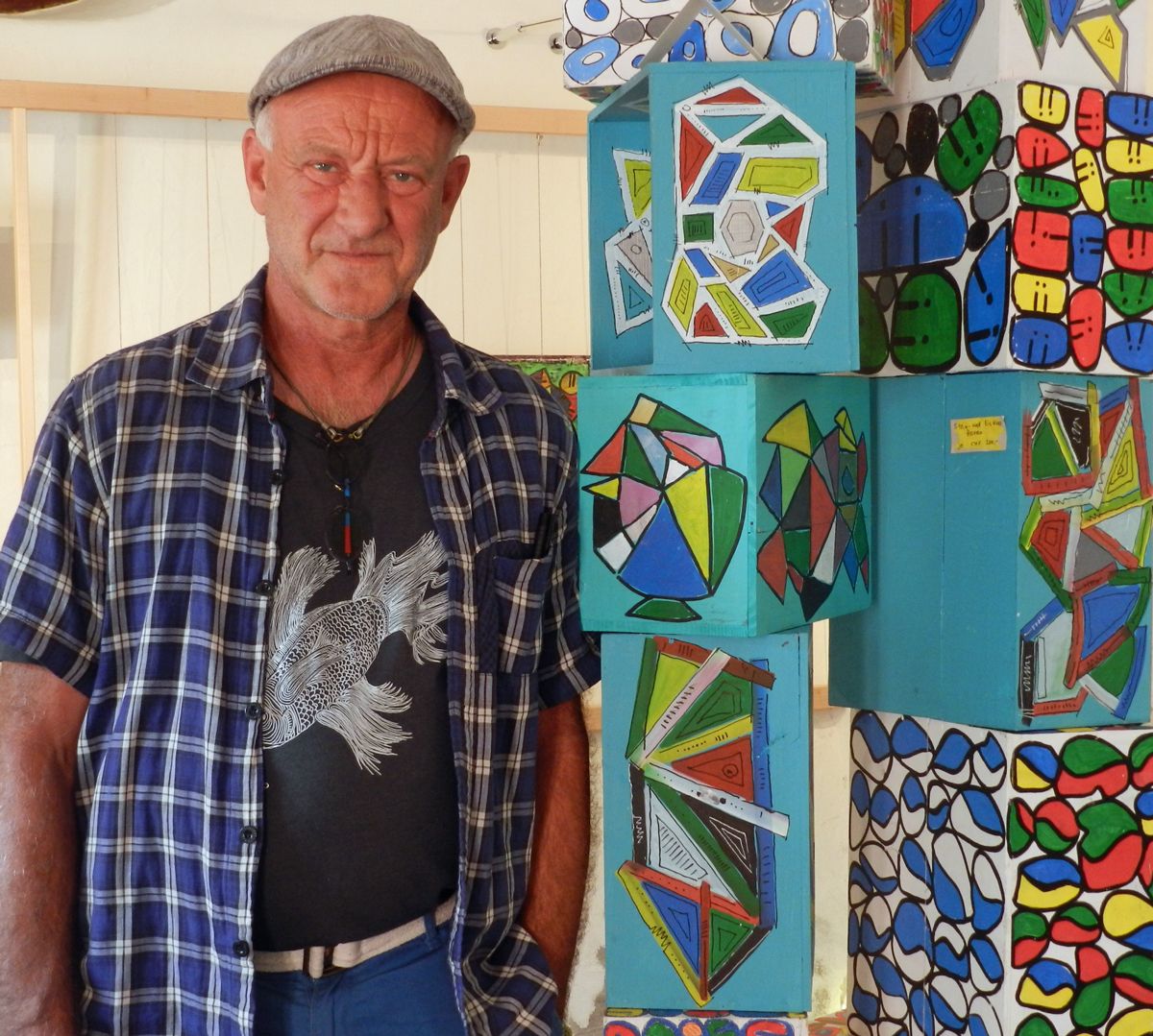 L’artist Christoph Koepfli da Turich expuona sias ouvras illa Grotta da cultura a Sent (fotografia: Annatina Filli).
