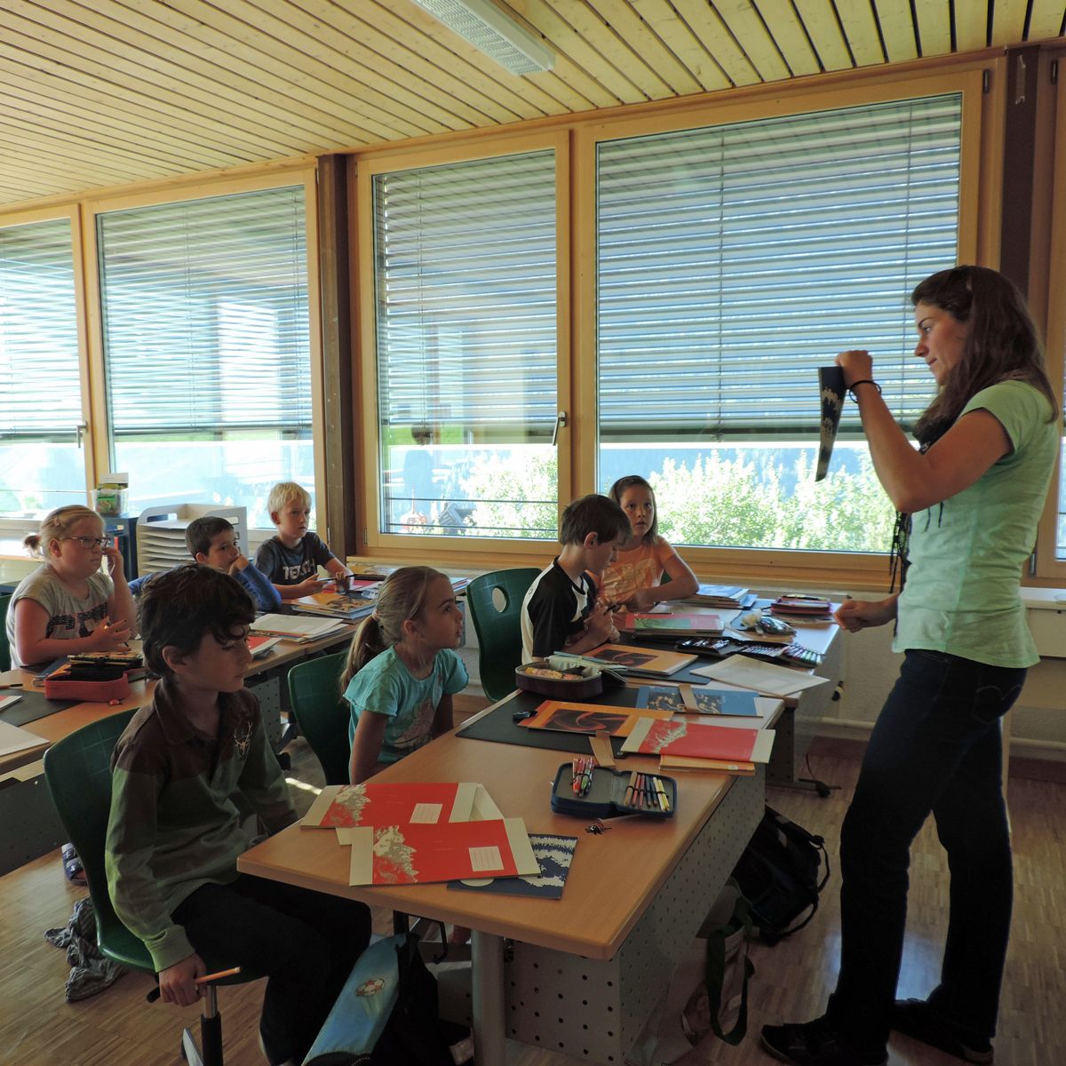 Ils scolars da Sent taidlan attents a las explicaziuns da la nouva magistra Marina Jann (fotografias: Selina ).