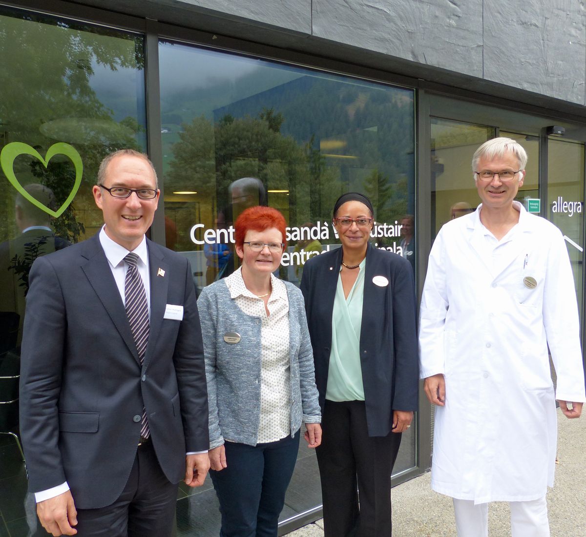 Christian Rathgeb ha lodà la lavur dals respunsabels dal CSVM, quia cun Judith Fasser, Gabriella Binkert-Becchetti e Theodor von Fellenberg davant il Center da sandà regiunal a Sta. Maria (fotografia: Flurin Andry).