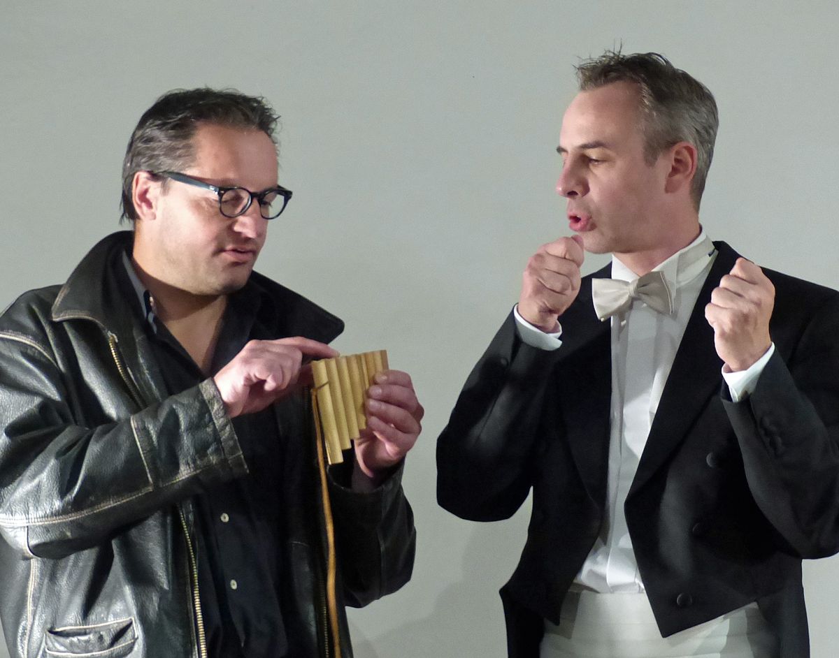 Il cellist Alain Schudel (a dretta) declera ad Andrea Matossi da Scuol la rolla da Papagenus (fotografia: Flurin Andry).