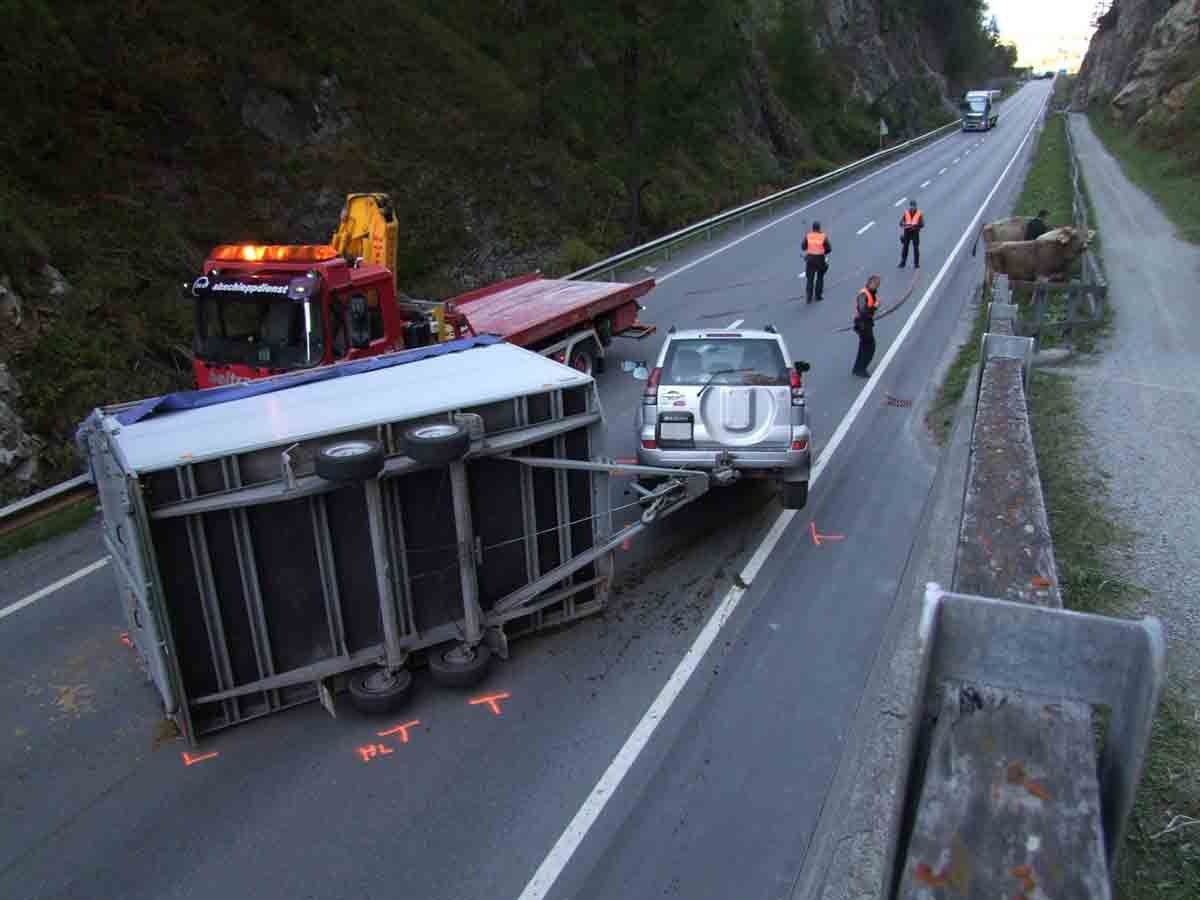 In St.Moritz ist am Dienstag kurz vor 17 Uhr ein Fahrzeuggespann verunfallt, bei dem sich der Anhänger mit drei Kühen überschlug. Diese wurden beim Aufprall aus dem Anhänger geworfen. Eine Kuh wurde geringfügig verletzt und musste vom Tierarzt behandelt werden.
