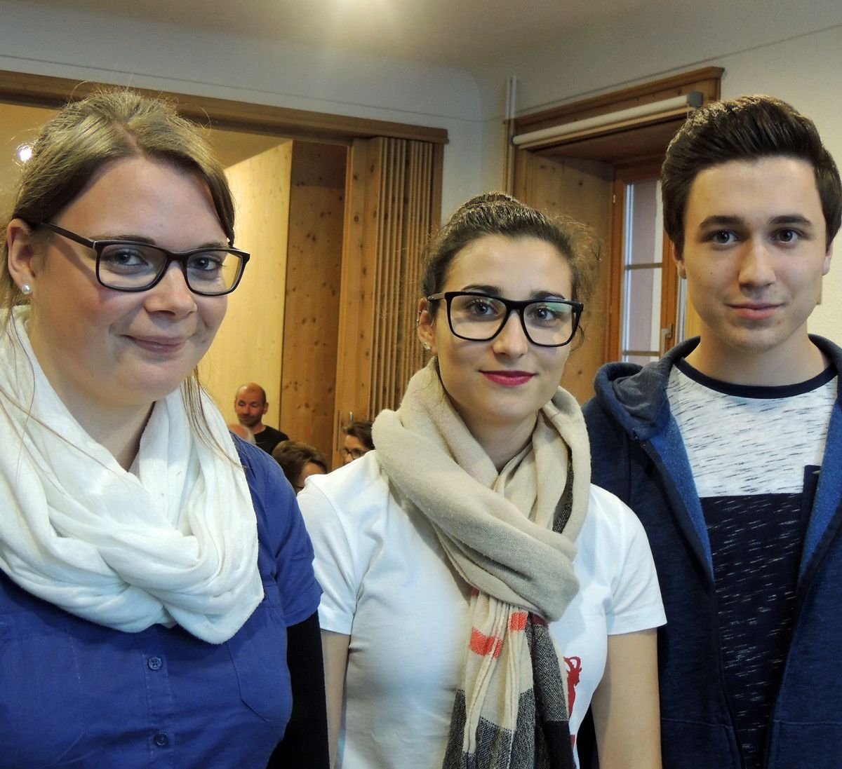 Ladina Clavadetscher, Marcia Ramos e Duri à Porta (da schnestra) han preschantà lur lavur (fotografia: Benedict Stecher).