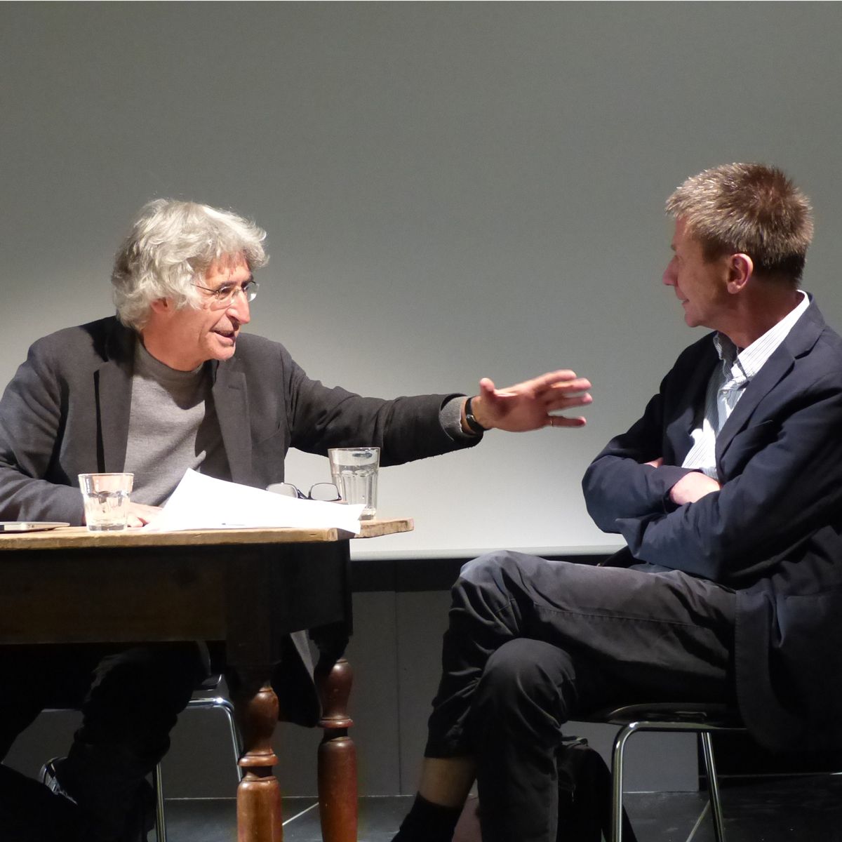 Clà Riatsch (a schnestra) e Manfred Koch in viva discussiun (fotografia: Flurin Andry).