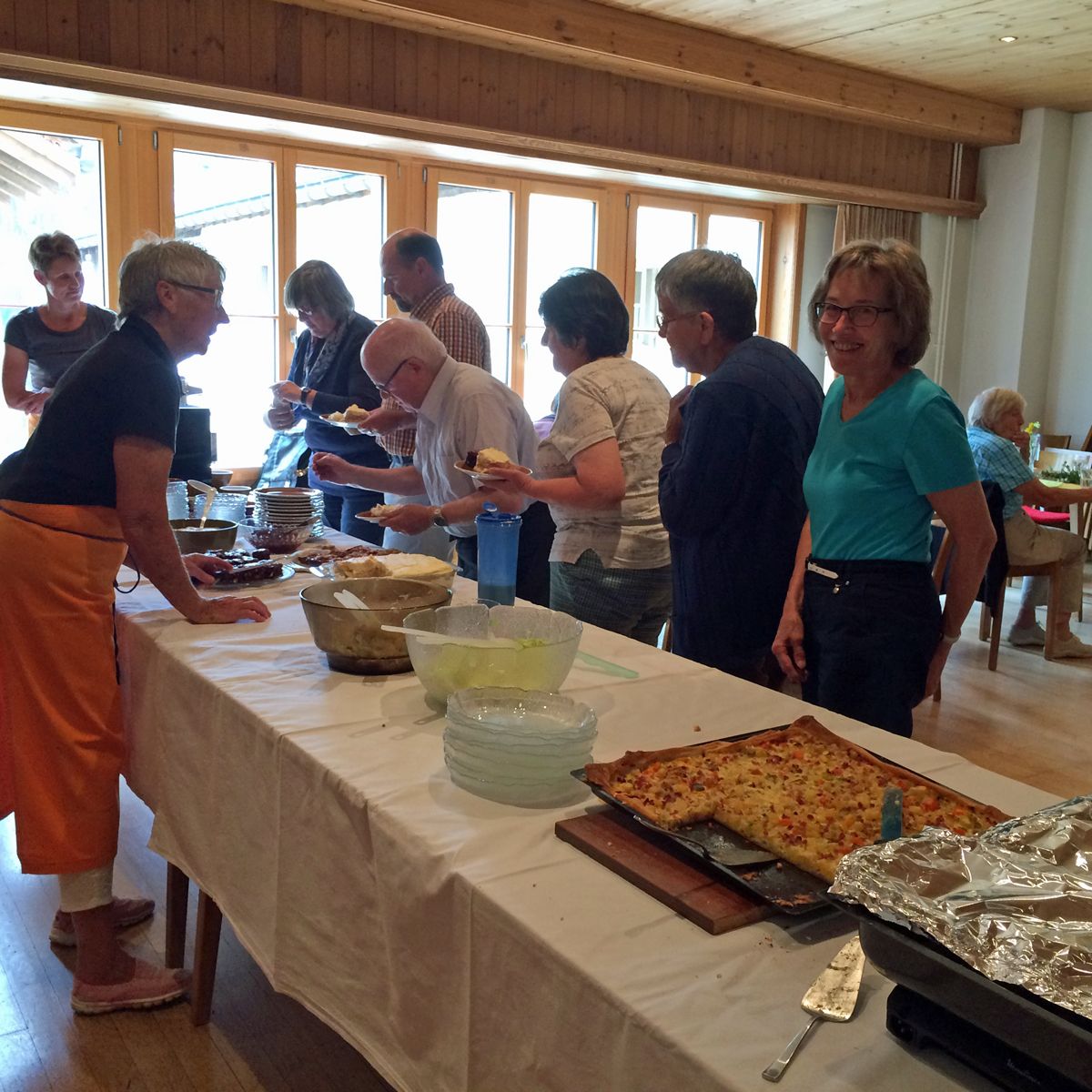 Illa sala in chasa da pravenda evangelica a Scuol pon giodair ils preschaints ün giantar in cumpagnia. In venderdi chi vain po la glieud darcheu as servir pro’ls differents buffets (fotografia: Ursula Grimbichler).