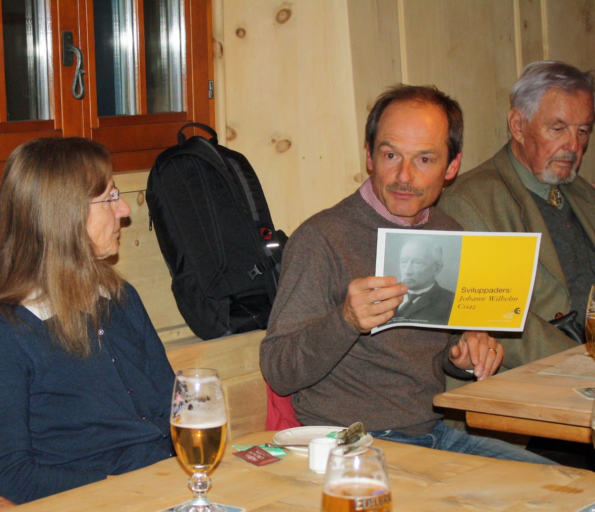 Hans Lozza discuta culs partecipants dal «tavulin rumauntsch» sur dal parc naziunel (fotografia: Erna Romeril).
