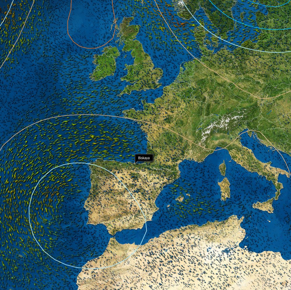 Die komplizierten Wind-Strömungsverhältnisse über dem Golf von Biskaya (links zwischen den Britischen Inseln und Spanien) beeinflussen das Wetter regelmässig auch hierzulande. Grafik: www.meteoea