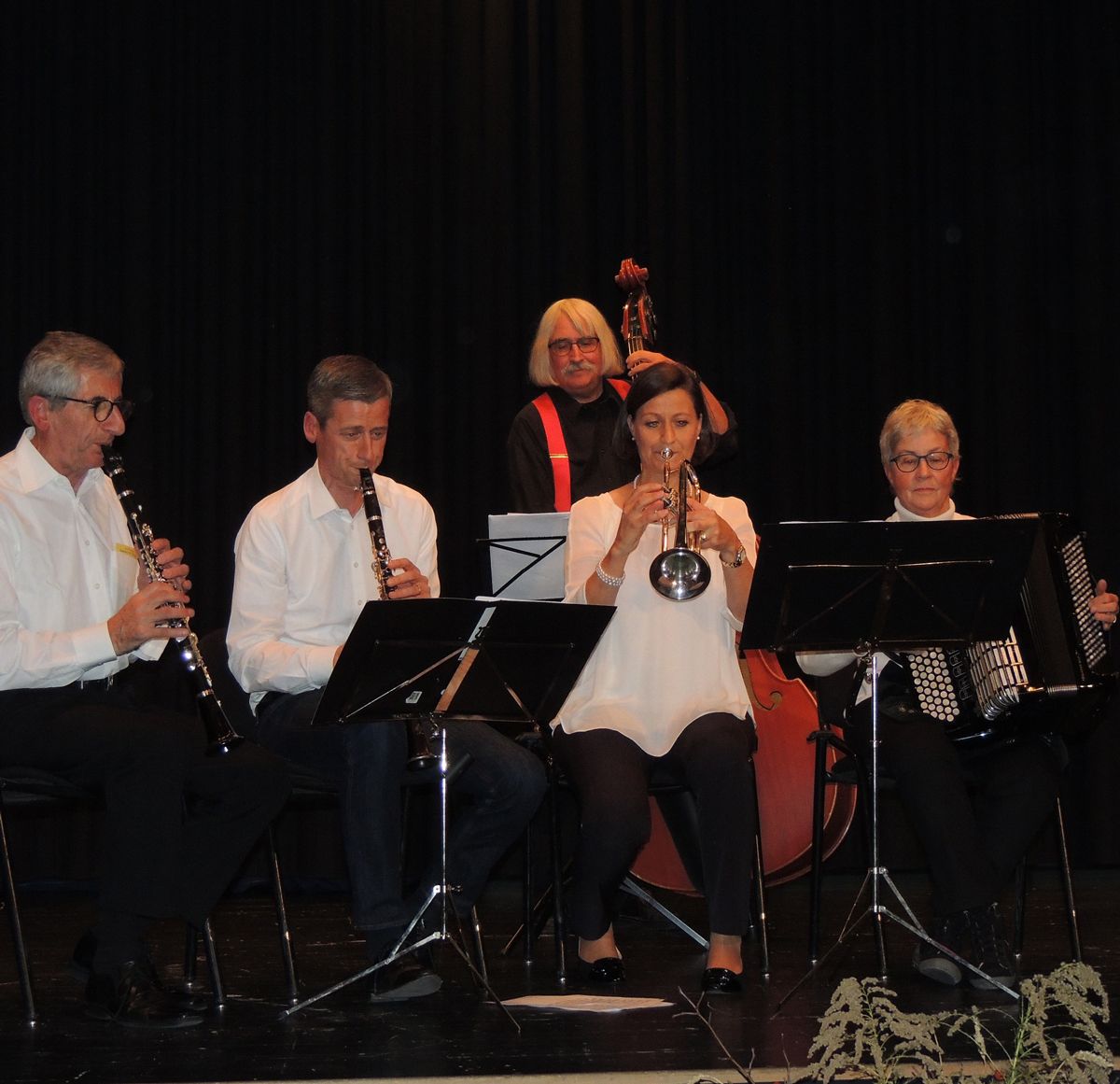 La fuormaziun cun Jachen Erni, Jon Erni, Ueli Mooser, Antonia Albani e Nina Grass (da schnestra) ha sunà i’l sen dad Anton Erni per cha las melodias veglias popularas vivan inavant (fotografia: Benedict Stecher).