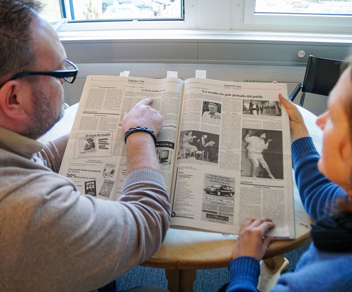 Ils duos redactuors da la Posta Ladina, Nicolo Bass e Selina Bisaz, han sföglià illa prüm’ediziun da la Posta Ladina. Per la prüma Posta Ladina dal 1996 es statta respunsabla Marcella Maier (fotografia: Jon Duschletta).