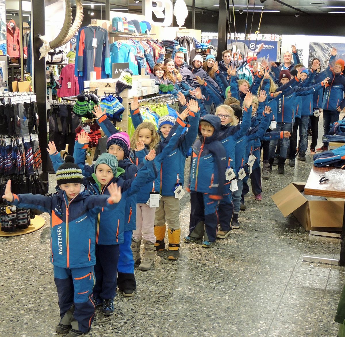 Ils uffants han plaschair da lur dress nouv. L’organisaziun OJ Motta Naluns Scuol ha ün nouv logo. Il material da trenamaint ha la OJ insembel culs clubs da skis da Scuol, Ftan e Sent (fotografia: Benedict Stecher).