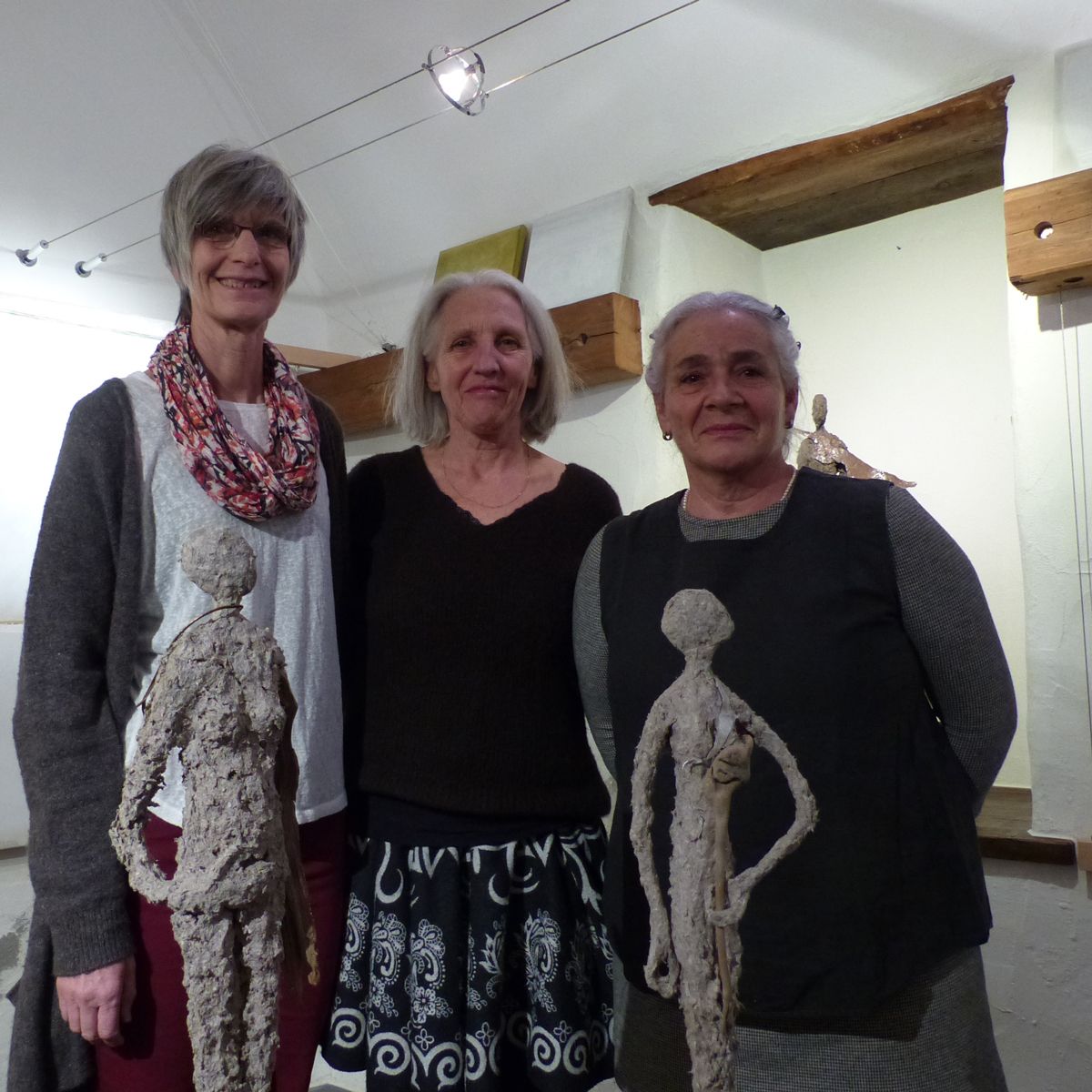Las trais artistas Tina Planta, Ursina Gianotti e Tina Puorger (da schnestra) expuonan cumünaivelmaing illa Grotta da cultura a Sent (fotografia: Flurin Andry).