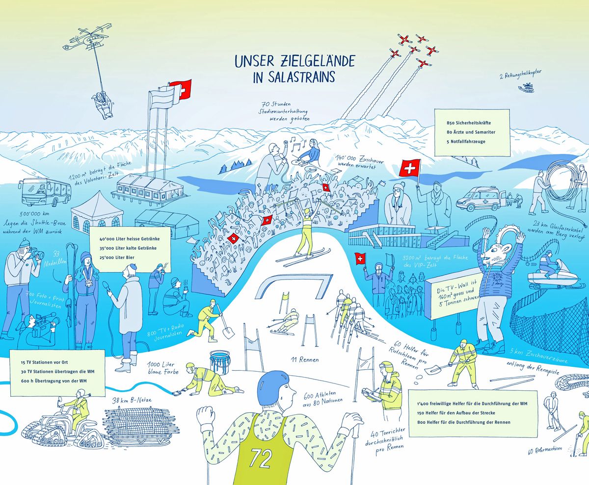 Fingià per la tschinchavla vouta es San Murezzan l’organisatur da las Maestranzas mundialas FIS ski alpin. Las ultimas lavuors da preparaziun vegnan fattas per retschaiver a partir dals 6 da favrer las millieras da persunas. Las ultimas infrastructuras vegnan installadas al böt a Salastrains.