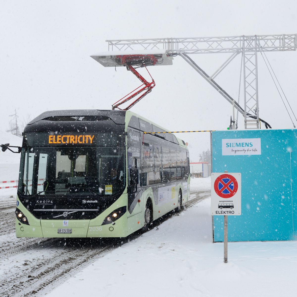 Der Hybrid-Bus wird mittels der mobilen Ladestation am St.Moritzer Bahnhof aufgeladen. Es ist die erste mobile Ladestation für Busse weltweit. Jedesmal wenn der Bus dort hält, werden seine Batterien aufgeladen. Mit vollgeladener Batterie kann der ...