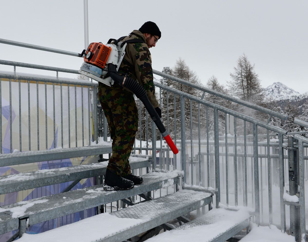 Emsiges Treiben am Sonntag vor der WM-Eröffnung auf Salastrains. Die Pistenteams sind ebenso an der Arbeit wie die Fernsehstationen, die die Kamerastandorte testen und sich so auf den Grossanlass vorbereiten. Und die grossen Tribünen werden mit Laubbläsern vom Schnee gereinigt.