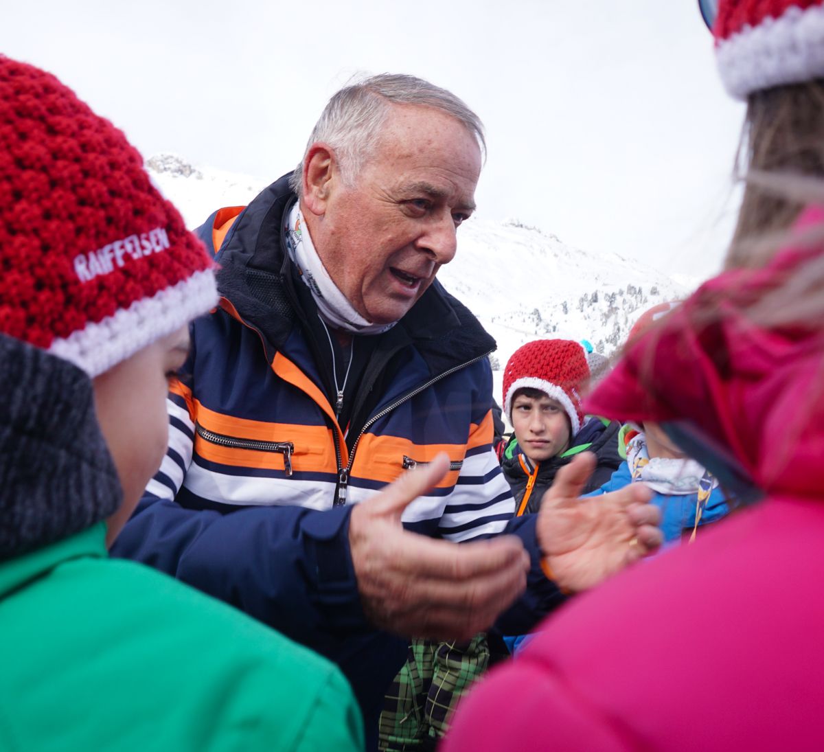 Der Ski-WM-Ehrengast und ehemalige Sportminister Adolf Ogi spricht im WM-Zielgelände zu den Schulkindern aus Müstair und beschwört sie: «Ihr seid die Zukunft.» Foto: Jon Duschletta