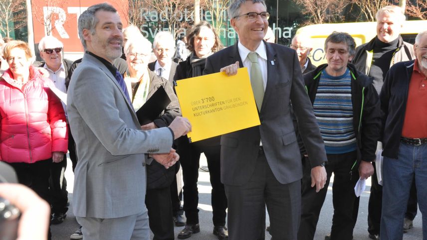 3828 Personen haben die Petition für eine bessere und ausgewogenere Kulturförderung im Kanton Graubünden unterschrieben. Vor dem Grossratsgebäude überreichte Nic Schmid seitens der Initianten Standespräsident Michael Pfäffli ein symbolisches Schild. Die Petition hatte gerade in den letzten Tagen noch einen markanten Zuspruch verzeichnet.