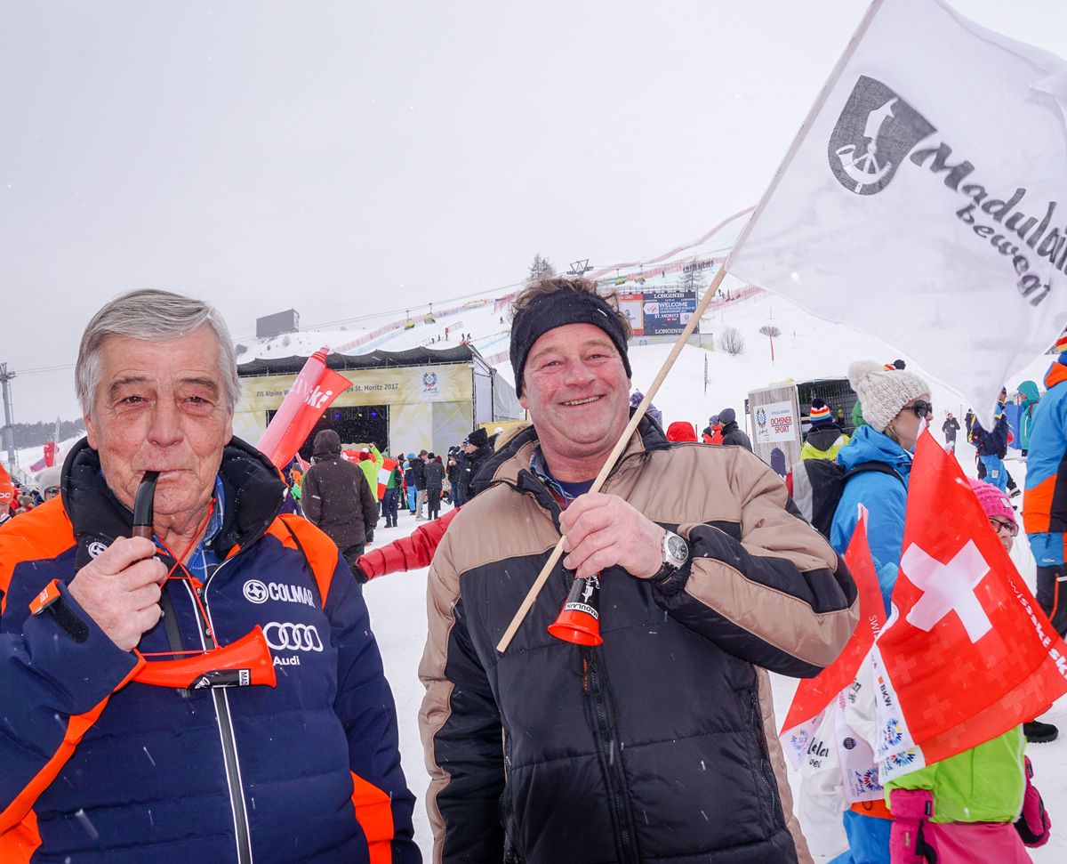 Zwei von 190 Madulainer Ski-Fans am WM-Super-G der Damen: Vito Hohenegger (links) und Silvio Lenz mit dem Gemeindemotto: «Madulain bewegt». Foto: Jon Duschletta
