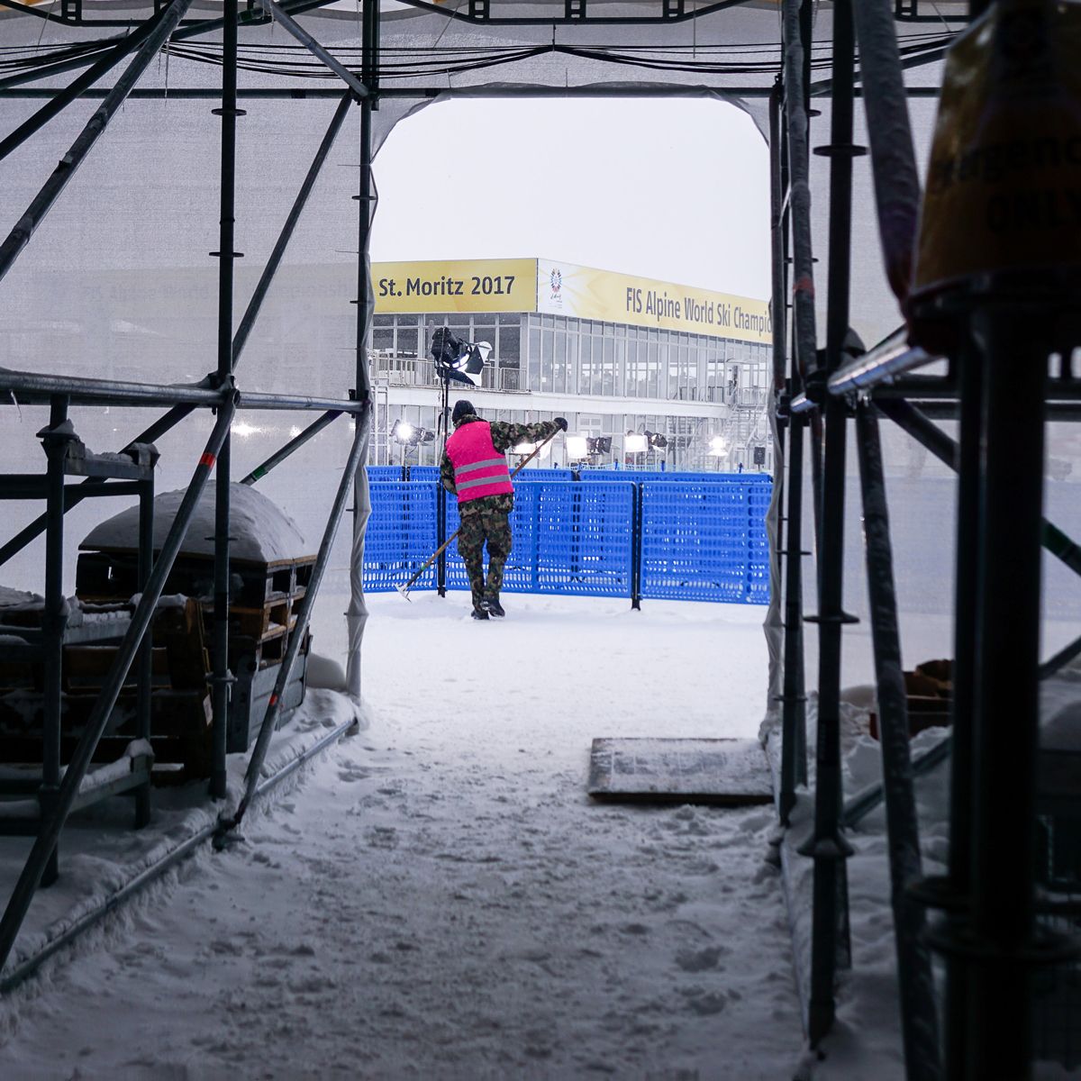 Uossa ho que nom sgumbrer, disfer, demonter ed alluntaner tuot ils fabricats temporars e refer la cuntredgia sü Salastrains darcho il stedi dad avaunt ils champiunedis mundiels da skis. fotografia: Jon Duschletta
