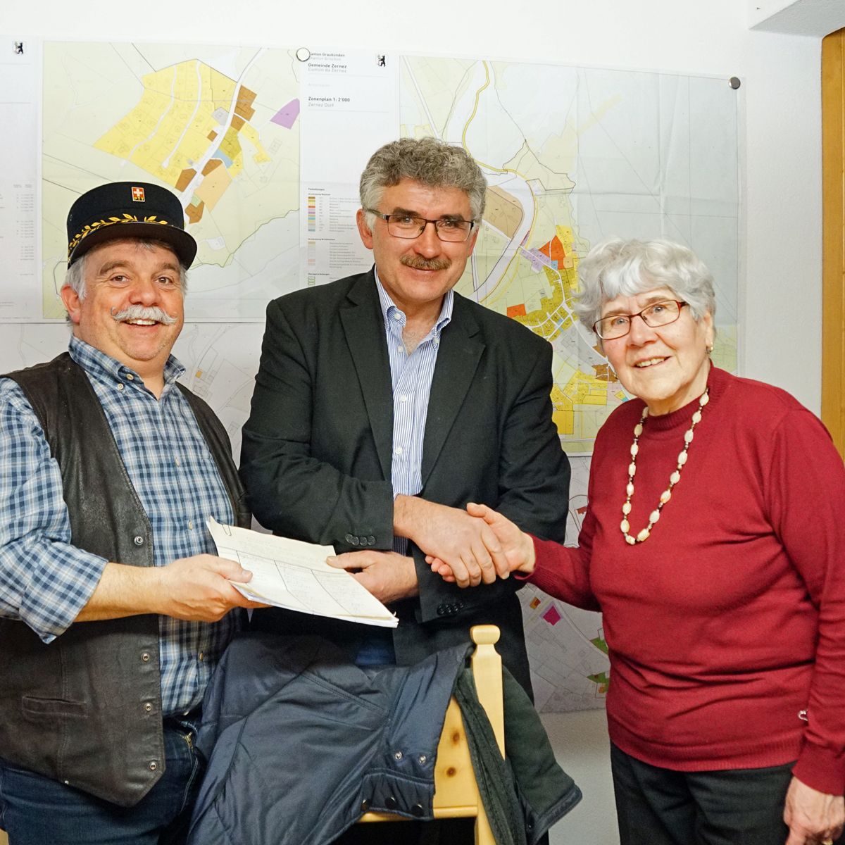 Tut incunter la petiziun our dals mans da Steivan Gaudenz ed Ulrica Guidon-Bisenz ha il president cumünal da Zernez, Emil Müller, immez sülla fotografia (fotografia: Jon Duschletta).