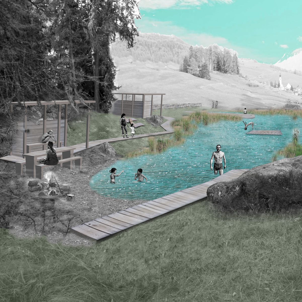 Il Lai Padnal a Ftan dess esser ün lö da recreaziun per giasts ed indigens. Unicamaing il mür da crap regorda als temps passats da l’oriund Lai Padnal (illustraziun: To Hariyo Freiraumgestaltung ).
