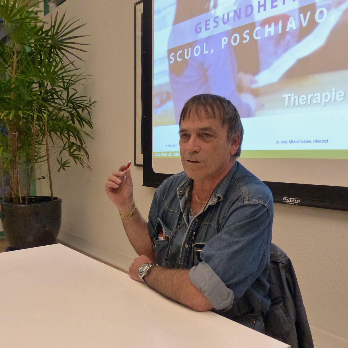 Il referent Michel Schlim es mincha marcurdi a Scuol e la gövgia üna jada a Scuol e tschella jada illa clinica da di a San Murezzan (fotografia: Flurin Andry).