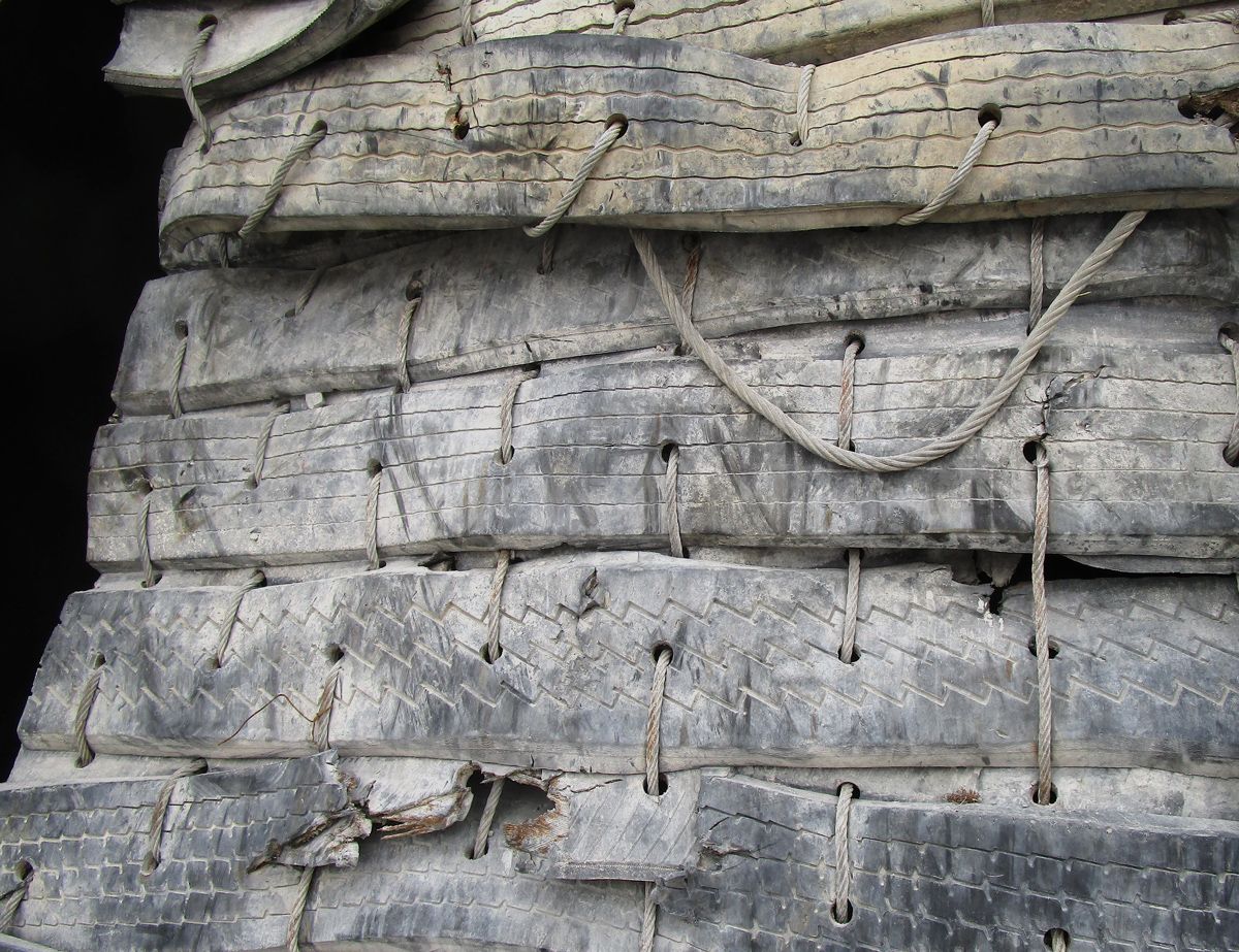 Am Portal eines Sicherheitsstollens des Umfahrungstunnels in Silvaplana hängt ein spezieller, grauschwarzer Windvorhang: ein «Vorhang» aus durch Stahlseile zusammengehaltenen Gummi-Pneus! Er könnte auch als «Kunst am Bau» durchgehen und Teil eines Kunstfestivals sein.
