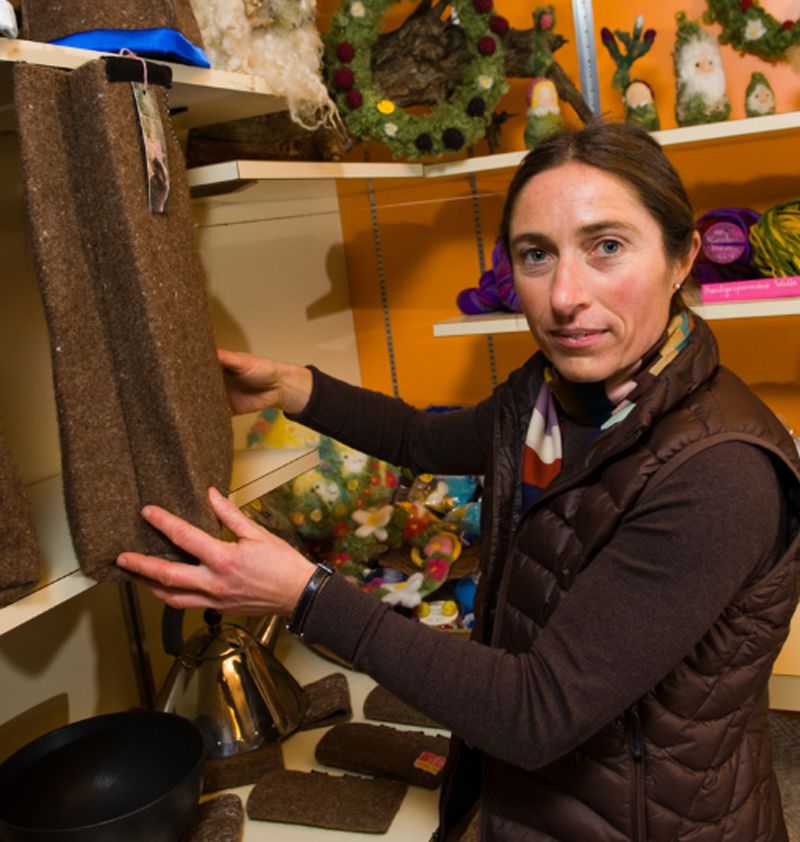 La Butia da bescha ad Ardez (sülla fotografia Claudia Janett chi preschainta nouvs prodots) ha survgni il premi d’innovaziun da la Regiun Engiadina Bassa/Val Müstair (fotografia: Schweizer Berghilfe.ch)