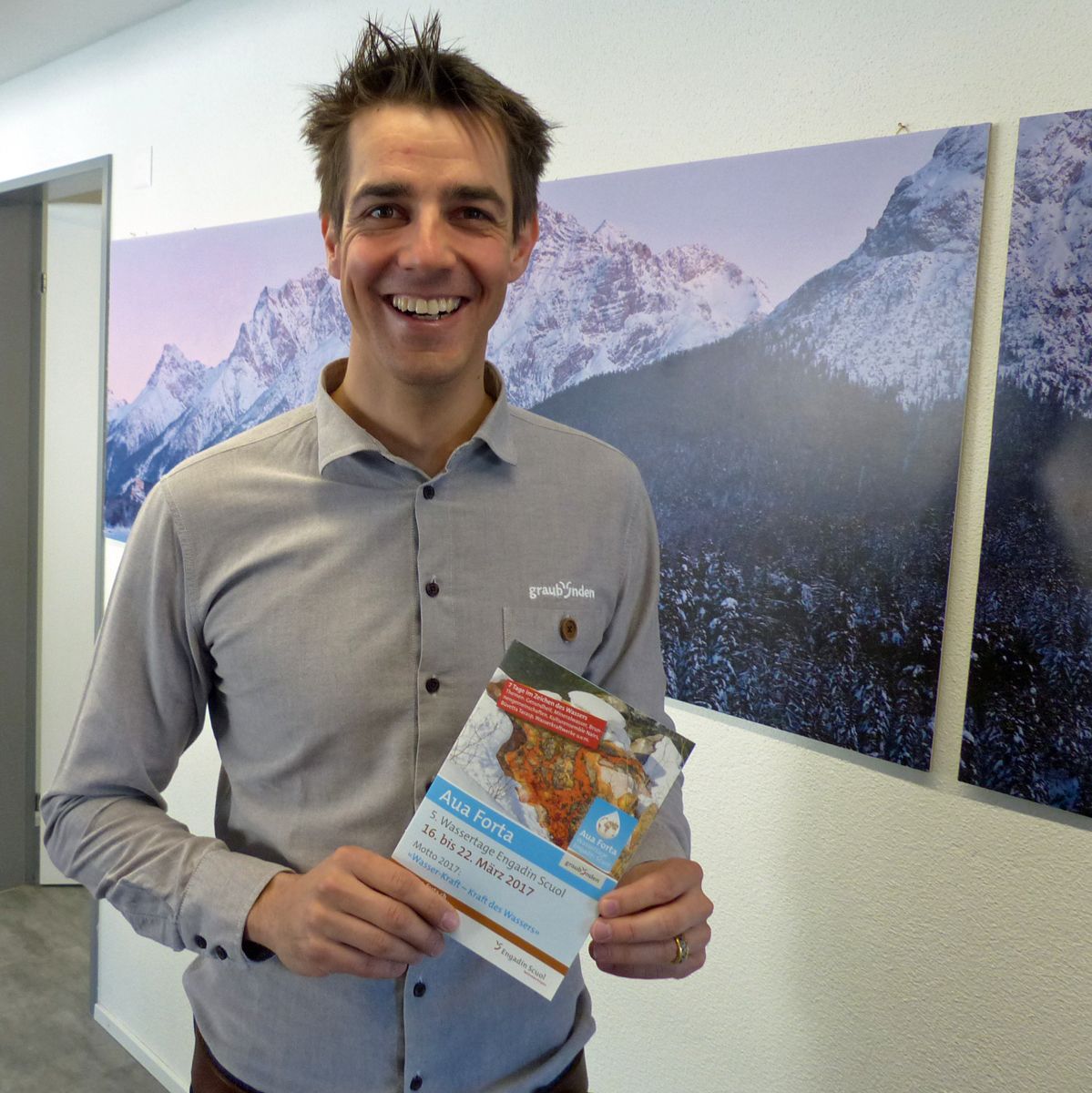 Niculin Meyer da la Turissem Engiadina Scuol Samignun Val Müstair SA es satisfat dal svilup dals dis tematics a Scuol e contuorns, suot l’insaina da l’aua (fotografia: Flurin Andry).