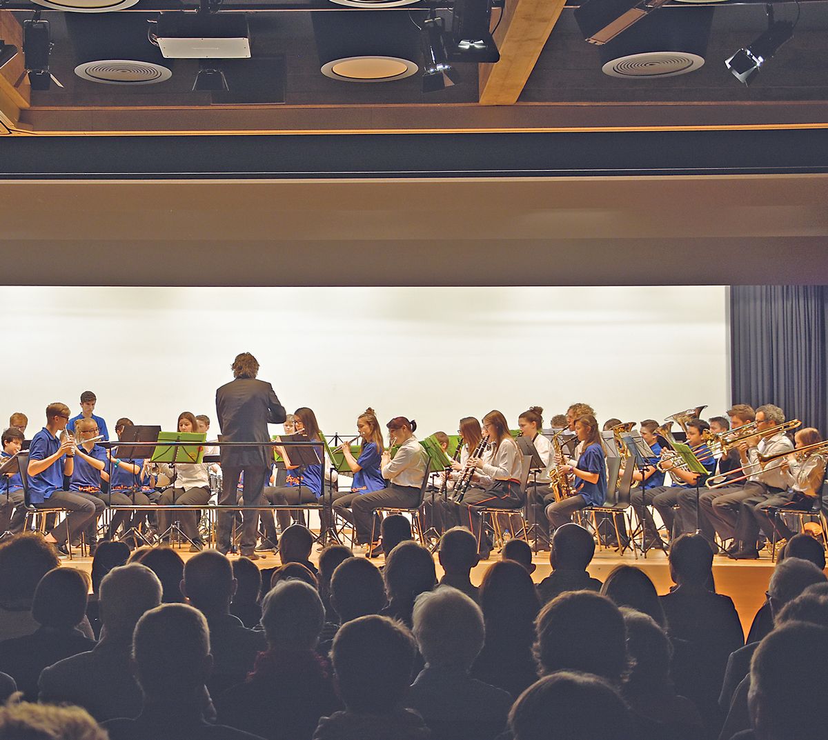 Sülla fotografia as vezza las duos fuormaziuns da giuvenils d’Engiadina Bassa suot la direcziun da Reto Mayer in occasiun dal concert ill’aula da la Scoula chantunala a Cuoira (fotografia: Nicolo Bass).