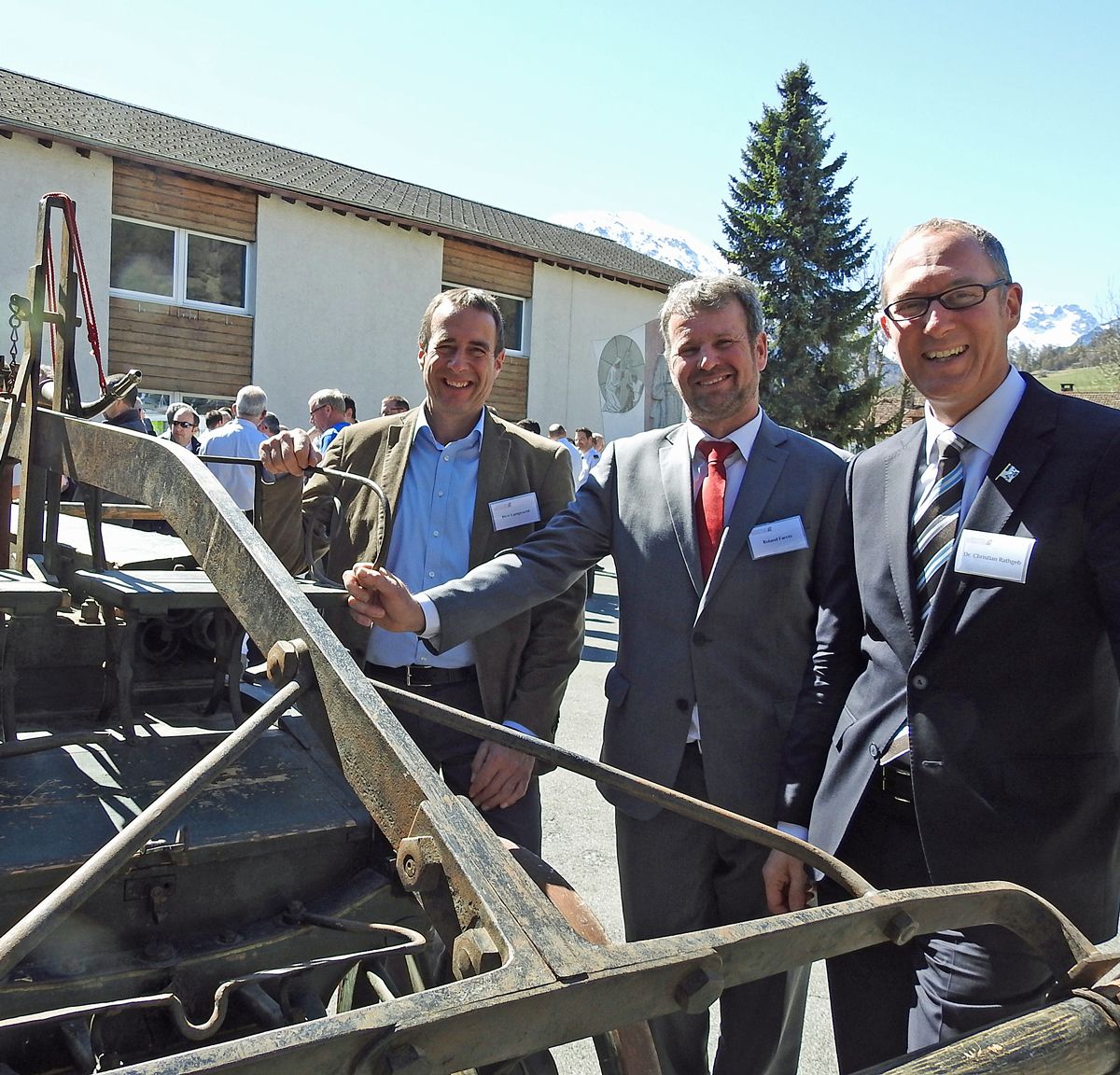Il president cumünal da Val Müstair, Rico Lamprecht (a schnestra) ha bivgnantà a Roland Farrér, president da l’Associaziun grischuna da pumpiers, ed al regent Christian Rathgeb in Val Müstair (fotografia: Nicolo Bass).