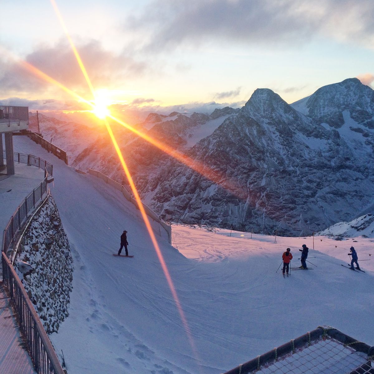 Heute Ostermontag war das Early Bird Skifahren am Corvatsch. 120 Skifahrer und Snowboarder kamen in den exklusiven Genuss, den Sonnenaufgang auf 3303 Meter zu geniessen und die frisch präparierten Pisten mit den ersten Sonnenstrahlen zu befahren. Foto: Co