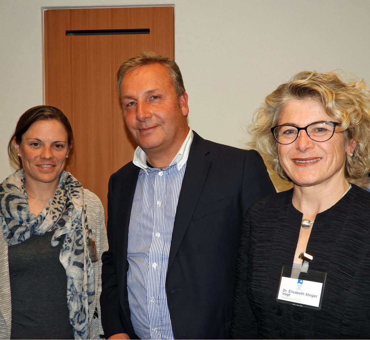 Muriel Hüberli, Jon Peer ed Elisabeth Steger Vogt (da schnestra) han orientà davart l’andamaint da l’Institut Otalpin Ftan (fotografia: Annatina Filli).