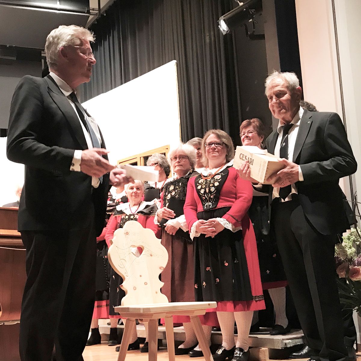Silvio Hunger verabschiedet den langjährigen Dirigenten des Cor Mixt da Champfèr Jachen Janett (rechts). Foto: Claudio Chiogna