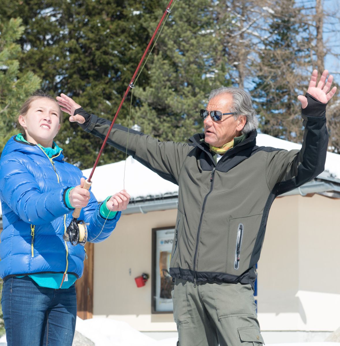 Foto: Werner Locher instruiert Sarina Misani beim Fliegenfischen. Foto: Reto Stifel