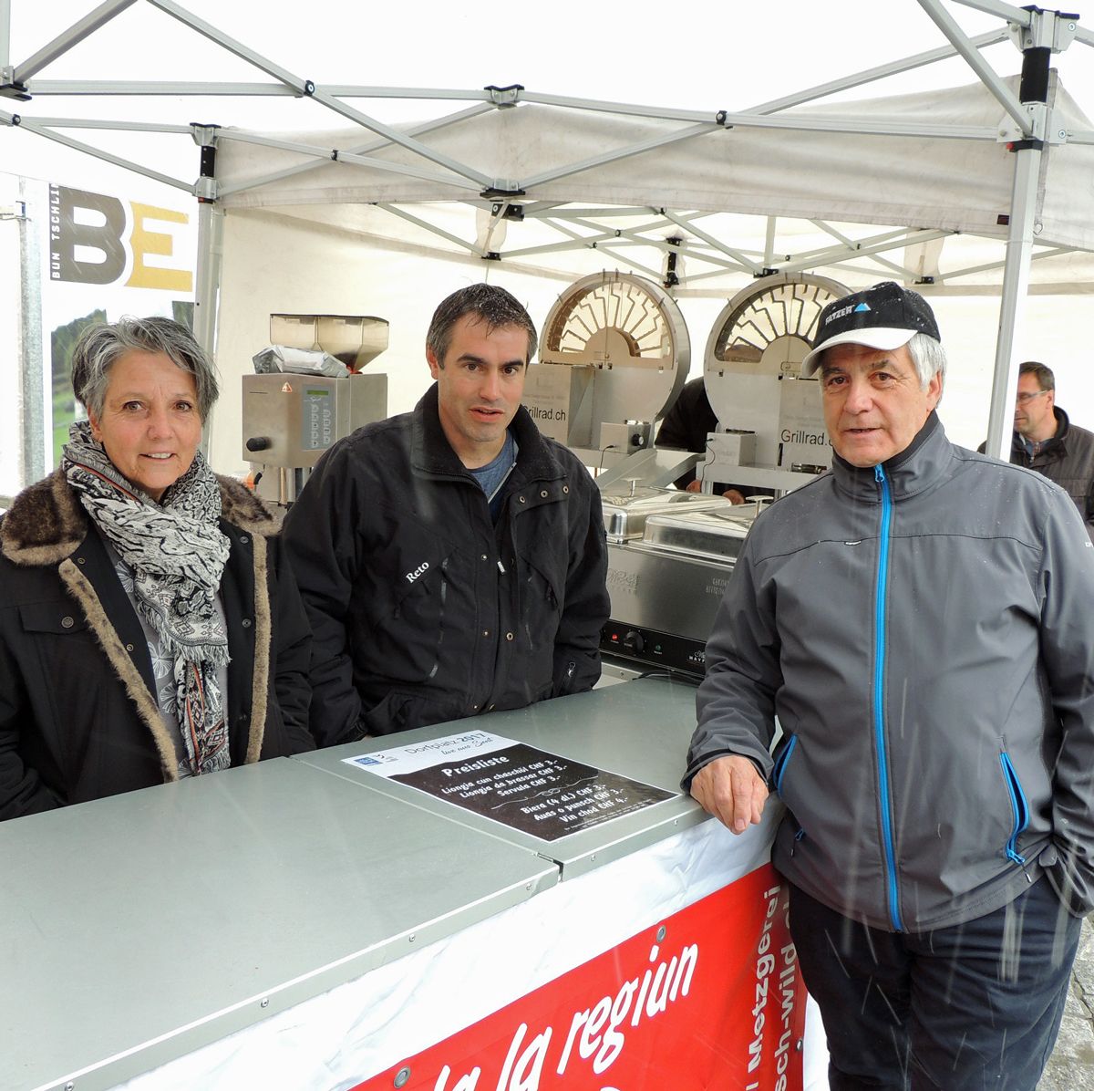 Nina Mader, Reto Rauch ed Andri Guler dal comitè d’organisaziun per «Dorfplatz» (fotografias: Benedict Stecher).